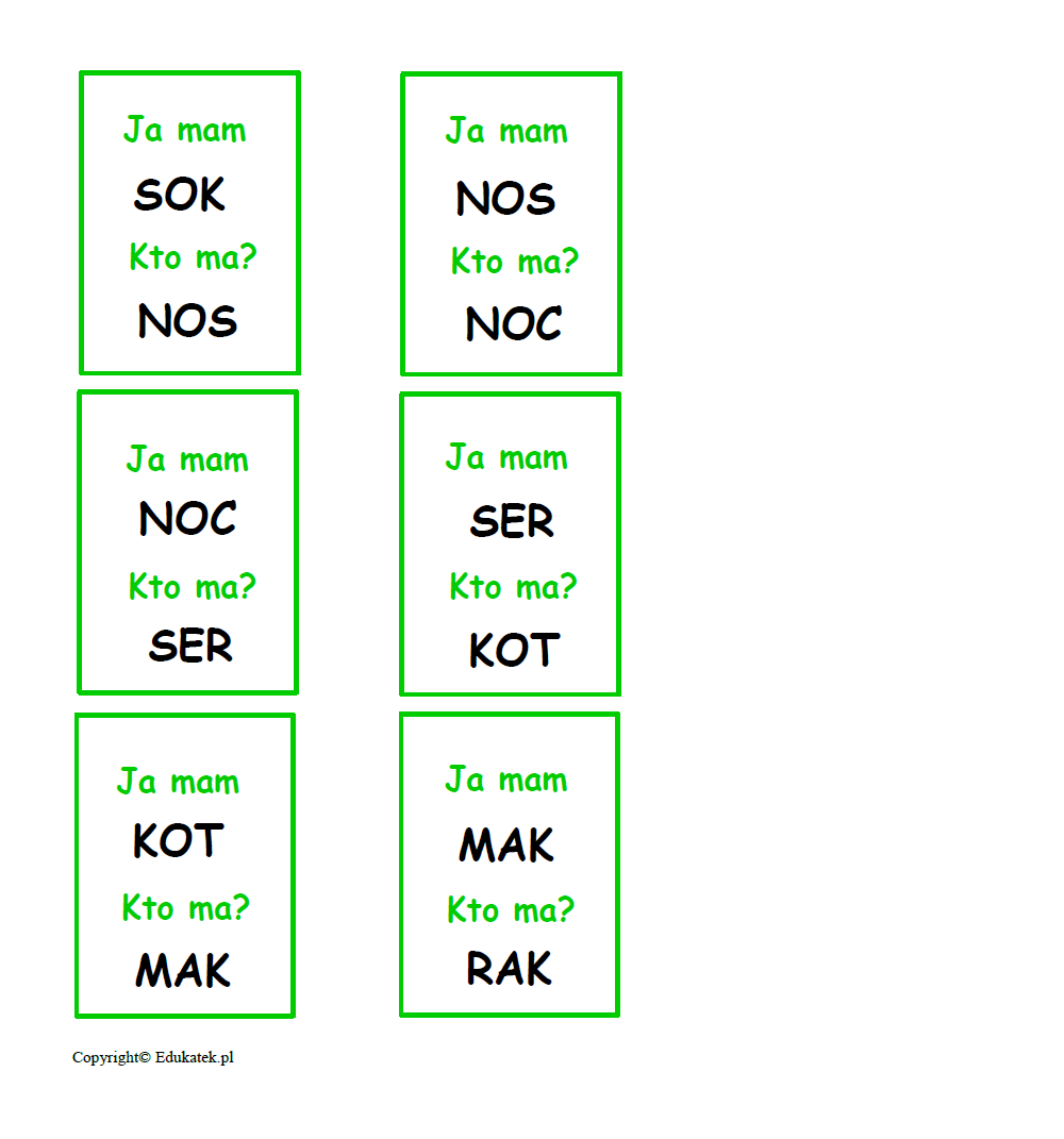 32 karty z wyrazami jednosylabowymi (zestaw trudniejszy, bo zawiera wszystkie polskie znaki- zmiękczenia, ogonki, itp.)
