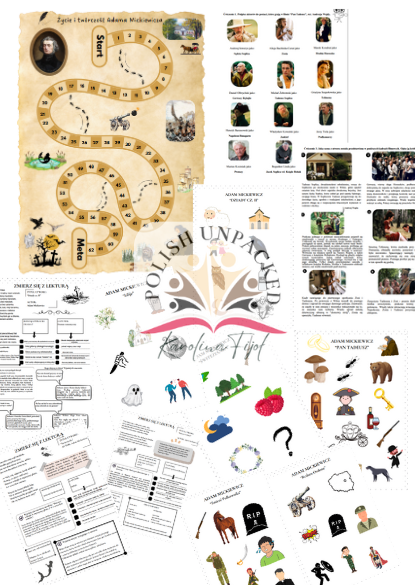 Zestaw zawiera: grę planszową, aż 62 pytania dotyczące życia Adama Mickiewicza i utworów: „Reduta Ordona”, „Śmierć Pułkownika”, „Dziady cz. II”, „Świtezianka”, „Pan Tadeusz” + opracowane przeze mnie odpowiedzi.
