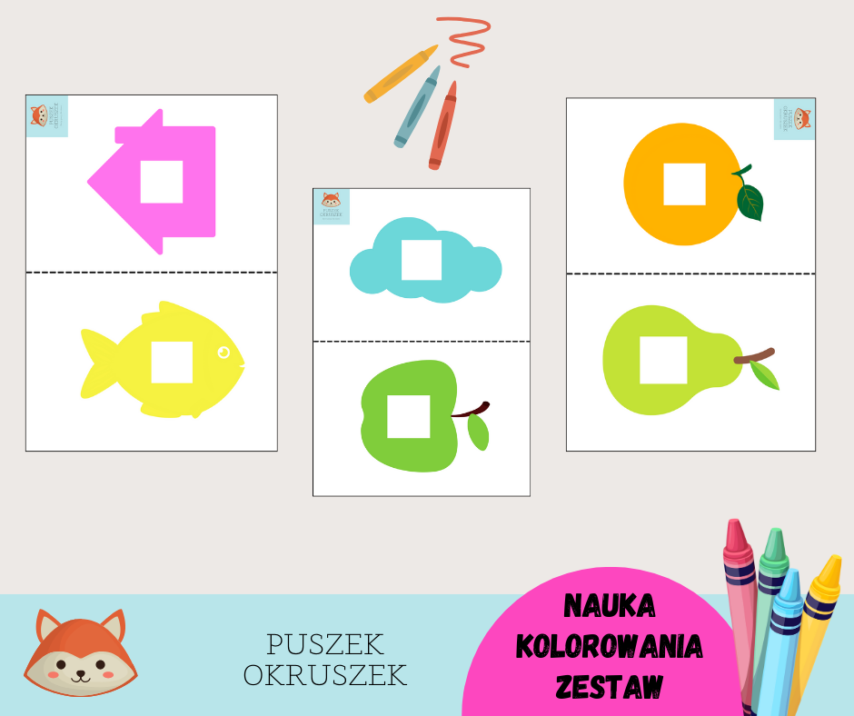 Zestaw 14 kart pracy to idealna pomoc dla małych dzieci, które stawiają pierwsze kroki w świecie kolorów.