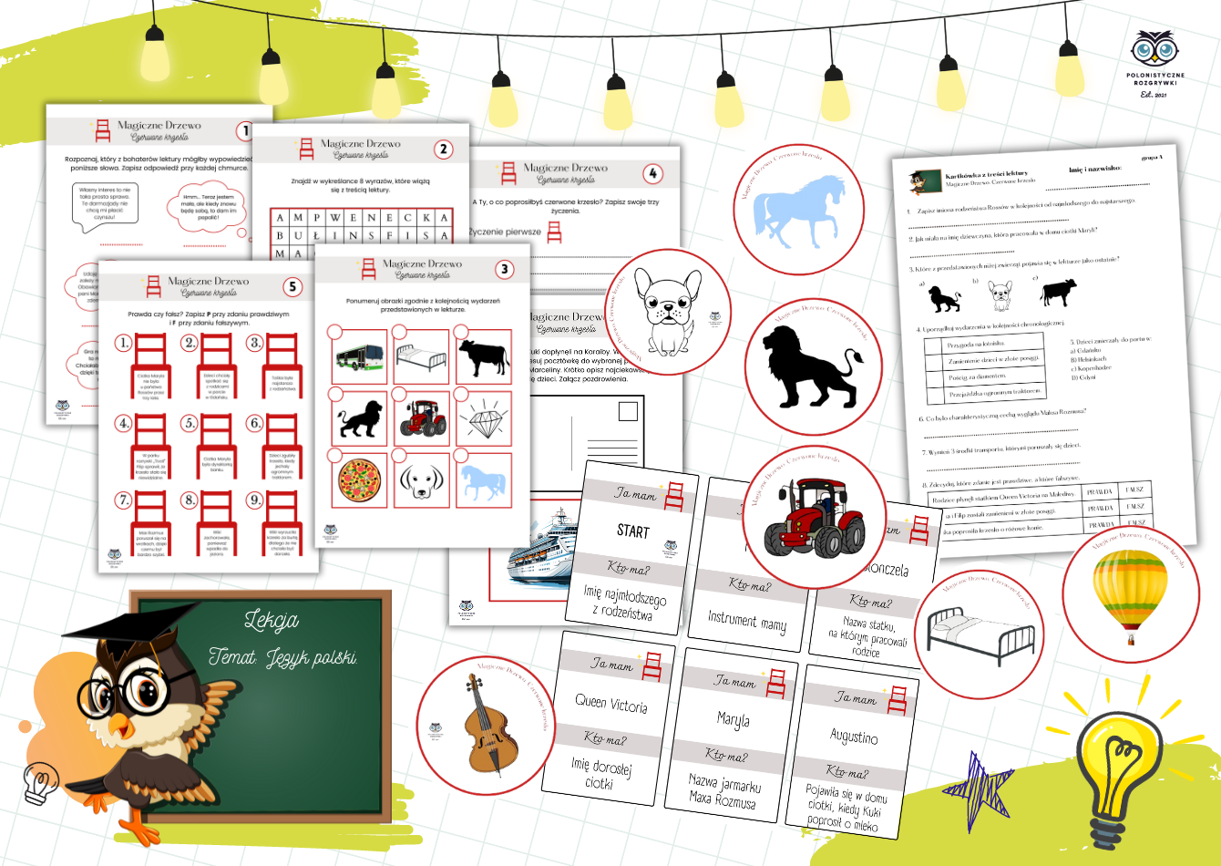 Zestaw lekturowy MAGICZNE DRZEWO. CZERWONE KRZESŁO. Kartkówka. Stacje zadaniowe. Ikony. Ja mam..., kto ma...?