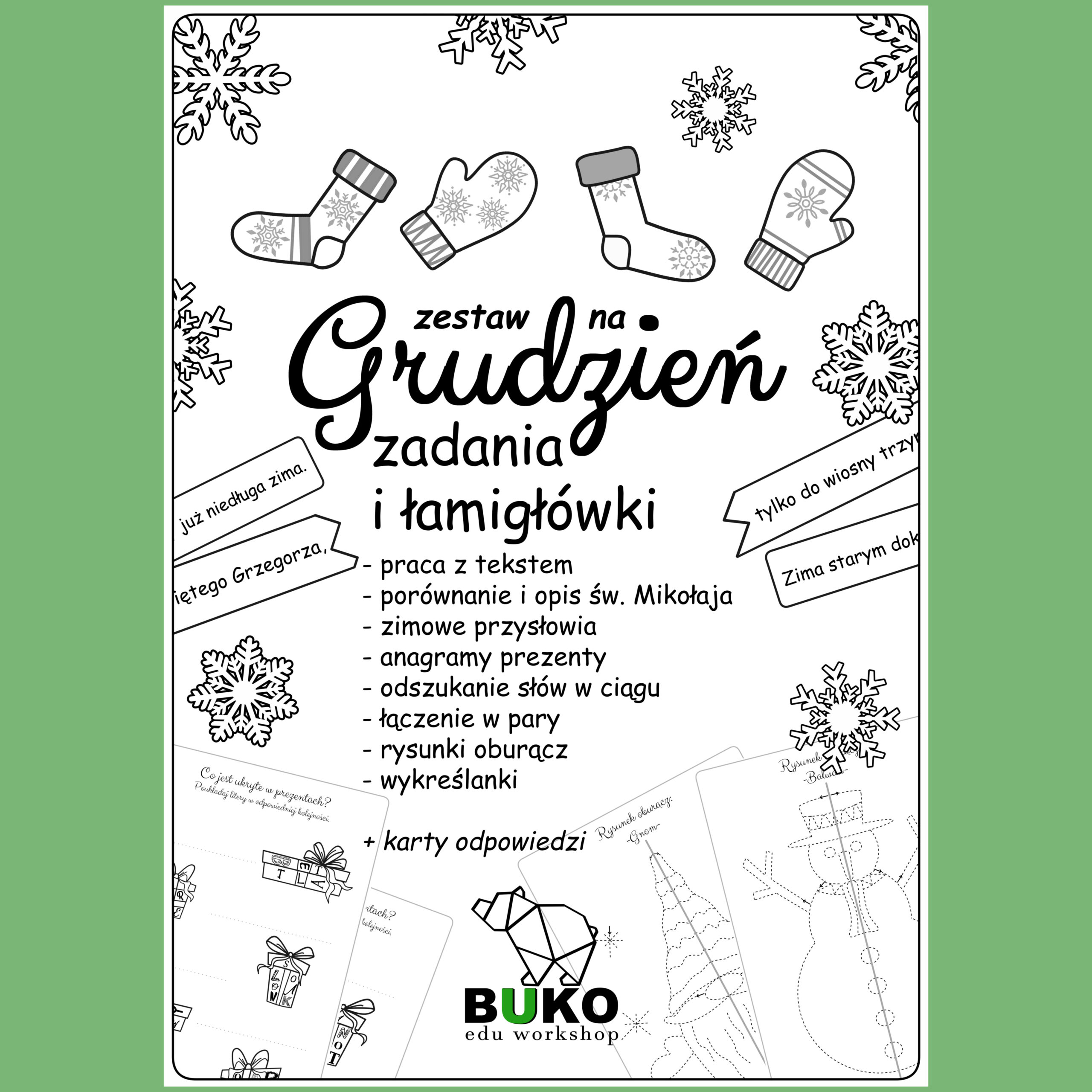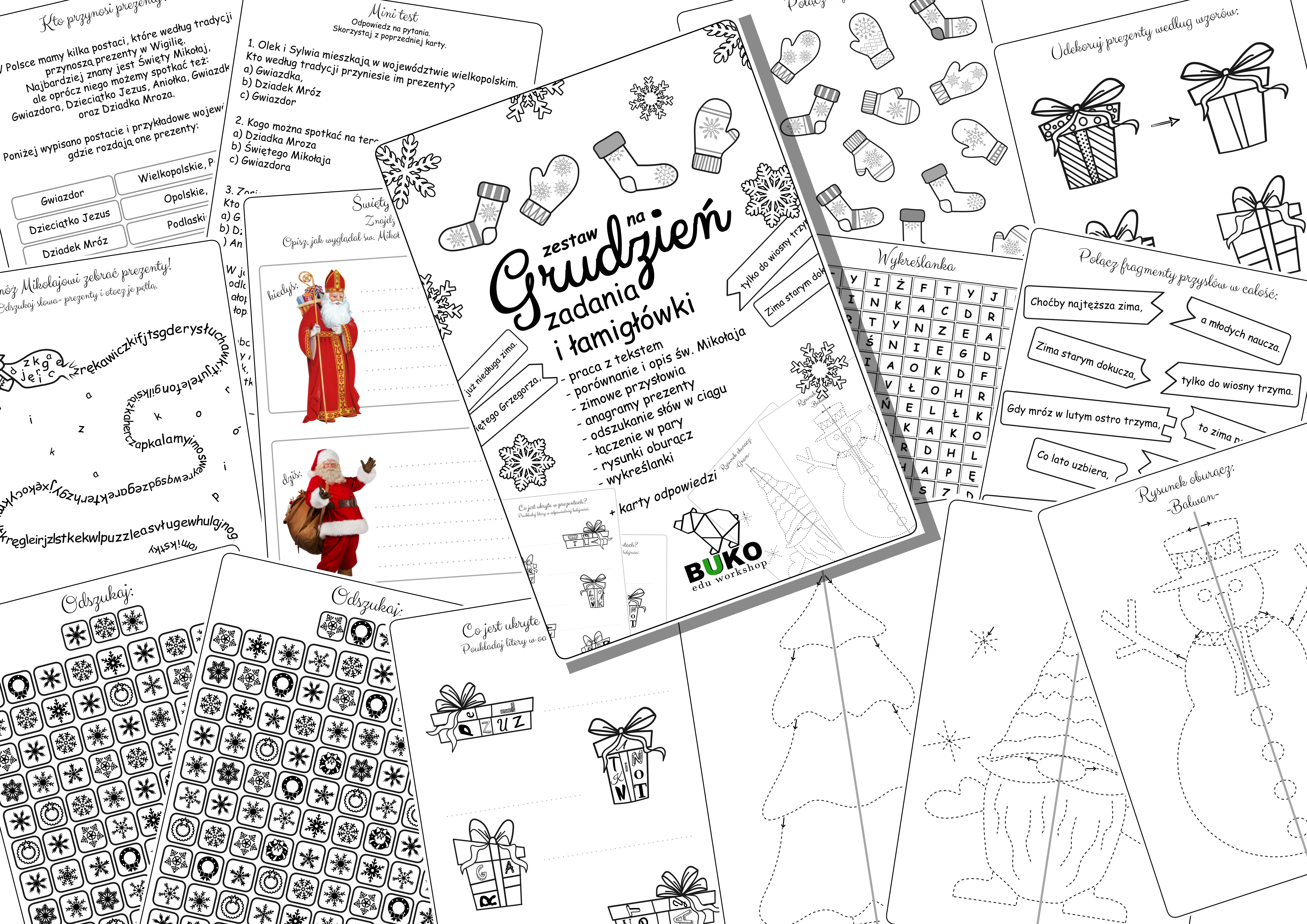 Zestaw Karty na GRUDZIEŃ (zadania i łamigłówki) zawiera: