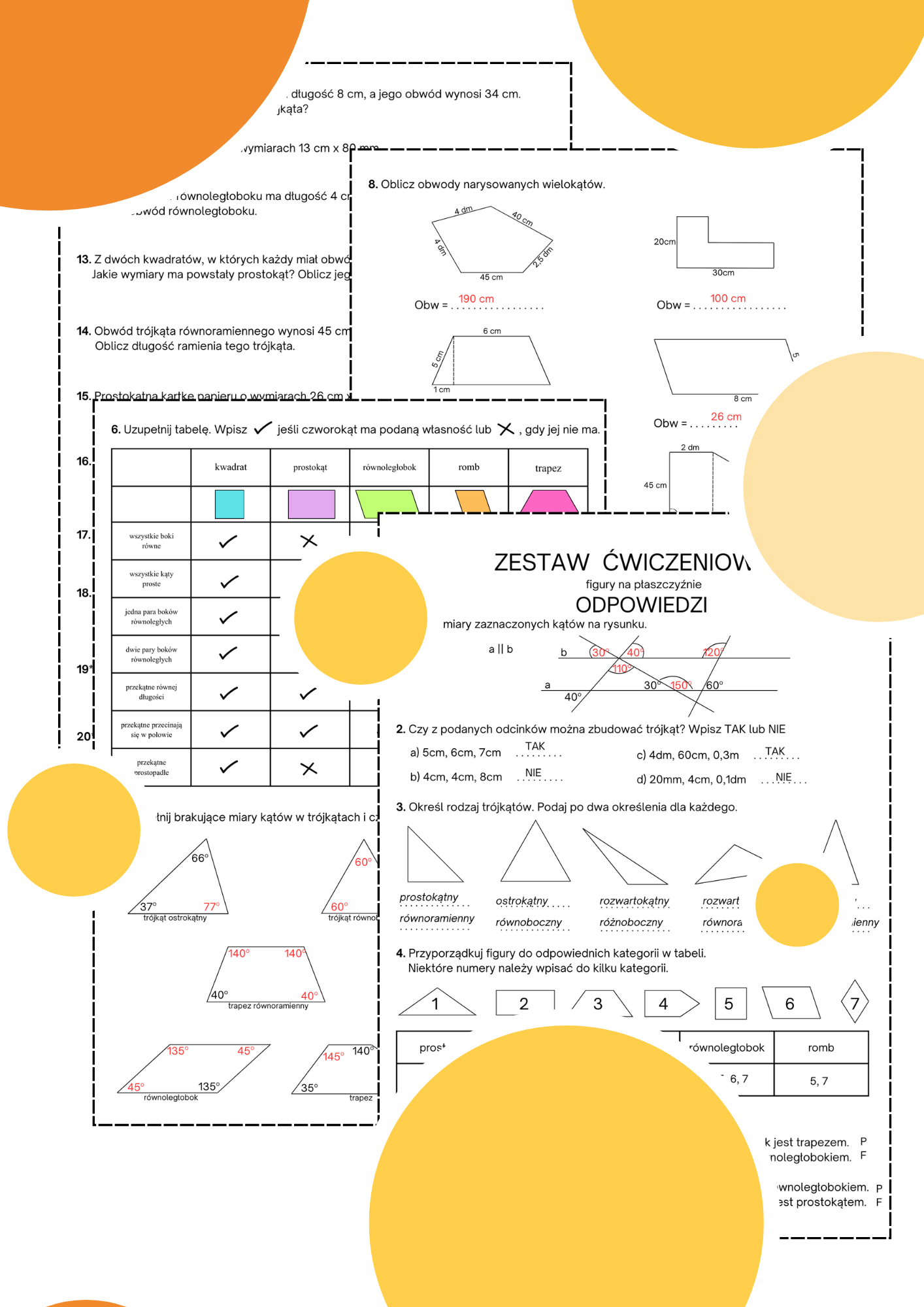 - kąty w trójkątach i czworokątach