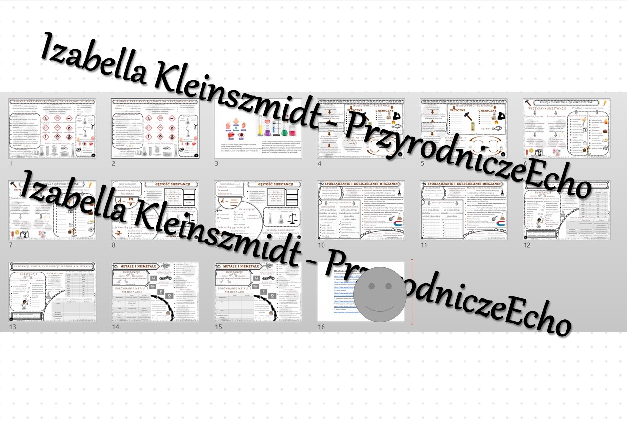 Witajcie Nazywam się Izabella Kleinszmidt (PrzyrodniczeEcho). Jestem nauczycielem przyrody, biologii, geografii i chemii w szkole podstawowej w Pomysku Wielkim. Uwielbiam mój zawód i cieszę się, że robię w życiu to co kocham. Pasja dla nauczyciela jest bardzo ważna:). Prowadzę stronę PrzyrodniczeEcho na FB, nagrywam filmiki do lekcji, konstruuję prezentacje i lekcje multimedialne, escape roomy oraz sketchnotki i karty pracy w programie power point. Zapraszam na stronę internetową mojej szkoły, gdzie znajdują się (niektóre darmowe) opracowania lekcji do przyrody, biologii, geografii i chemii w SP. Adres strony internetowej: https://sppomyskwielki.edu.pl - zakładka - dla ucznia. Od niedawna zapraszam również na moją stronę internetową: https://ikleinszmidt.wixsite.com/przyrodniczeecho Zapraszam do korzystania z mojej pracy:) Bardzo proszę również czytać opisy, aby wiedzieć, jaki materiał znajduje się w danym pliku. Zachęcam do kontaktu w razie jakichś pytań lub błędów w pomocach - brakach lub literówkach-wszystko można naprawić? Jakich materiałów możecie Państwo oczekiwać? SKETCHNOTKA - notatka kompletna z określonego tematu KARTA PRACY - zazwyczaj sketchnotka z wykropkowanymi miejscami PREZENTACJA MULTIMEDIALNA - kompletne wiadomości do odpowiedniego tematu wraz z grafiką i tekstem - zarówno w power point jak i genially - tę koniecznie należy zapisać na swoim koncie! LEKCJA MULTIMEDIALNA - pomysł na przeprowadzenie lekcji - taki "tok lekcji" - skrócony scenariusz ZESTAWY - proszę się wczytać w opis, informuję co mieści się w konkretnym zestawie:) Pozdrawiam cieplutko:)
