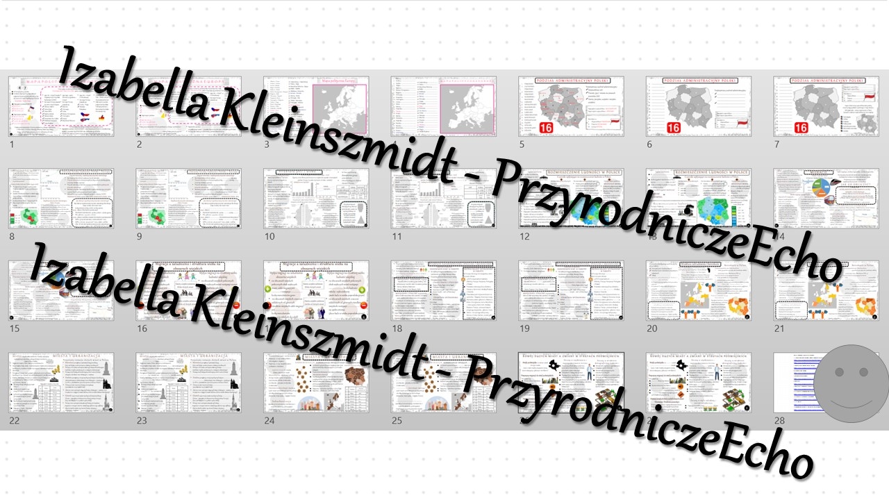 Witajcie Nazywam się Izabella Kleinszmidt (PrzyrodniczeEcho). Jestem nauczycielem przyrody, biologii, geografii i chemii w szkole podstawowej w Pomysku Wielkim. Uwielbiam mój zawód i cieszę się, że robię w życiu to co kocham. Pasja dla nauczyciela jest bardzo ważna:). Prowadzę stronę PrzyrodniczeEcho na FB, nagrywam filmiki do lekcji, konstruuję prezentacje i lekcje multimedialne, escape roomy oraz sketchnotki i karty pracy w programie power point. Zapraszam na stronę internetową mojej szkoły, gdzie znajdują się (niektóre darmowe) opracowania lekcji do przyrody, biologii, geografii i chemii w SP. Adres strony internetowej: https://sppomyskwielki.edu.pl - zakładka - dla ucznia. Od niedawna zapraszam również na moją stronę internetową: https://ikleinszmidt.wixsite.com/przyrodniczeecho Zapraszam do korzystania z mojej pracy:) Bardzo proszę również czytać opisy, aby wiedzieć, jaki materiał znajduje się w danym pliku. Zachęcam do kontaktu w razie jakichś pytań lub błędów w pomocach - brakach lub literówkach-wszystko można naprawić? Jakich materiałów możecie Państwo oczekiwać? SKETCHNOTKA - notatka kompletna z określonego tematu KARTA PRACY - zazwyczaj sketchnotka z wykropkowanymi miejscami PREZENTACJA MULTIMEDIALNA - kompletne wiadomości do odpowiedniego tematu wraz z grafiką i tekstem - zarówno w power point jak i genially - tę koniecznie należy zapisać na swoim koncie! LEKCJA MULTIMEDIALNA - pomysł na przeprowadzenie lekcji - taki "tok lekcji" - skrócony scenariusz ZESTAWY - proszę się wczytać w opis, informuję co mieści się w konkretnym zestawie:) Pozdrawiam cieplutko:)
