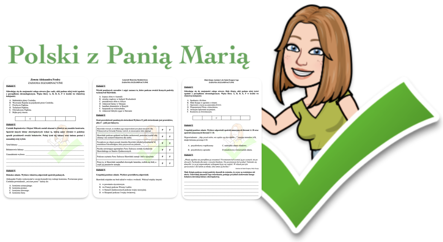 Polecam zestaw zadań egzaminacyjnych do lektur: “Mały Książę”, “Latarnik”, “Zemsta”. Każdy zestaw zawiera kilkanaście zadań wraz z kluczami odpowiedzi. W ZESTAWIE TANIEJ!