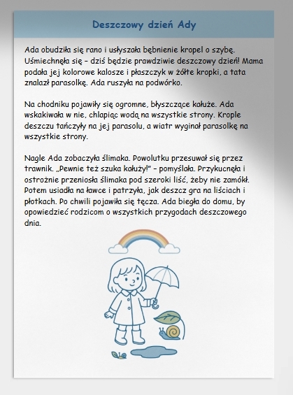 📖 Opowiadania do czytania – krótkie, ciepłe bajki, które można czytać razem (np. „Deszczowy dzień Ady”, „Tęczowy parasol”, „Zwierzątka chowają się przed burzą”).