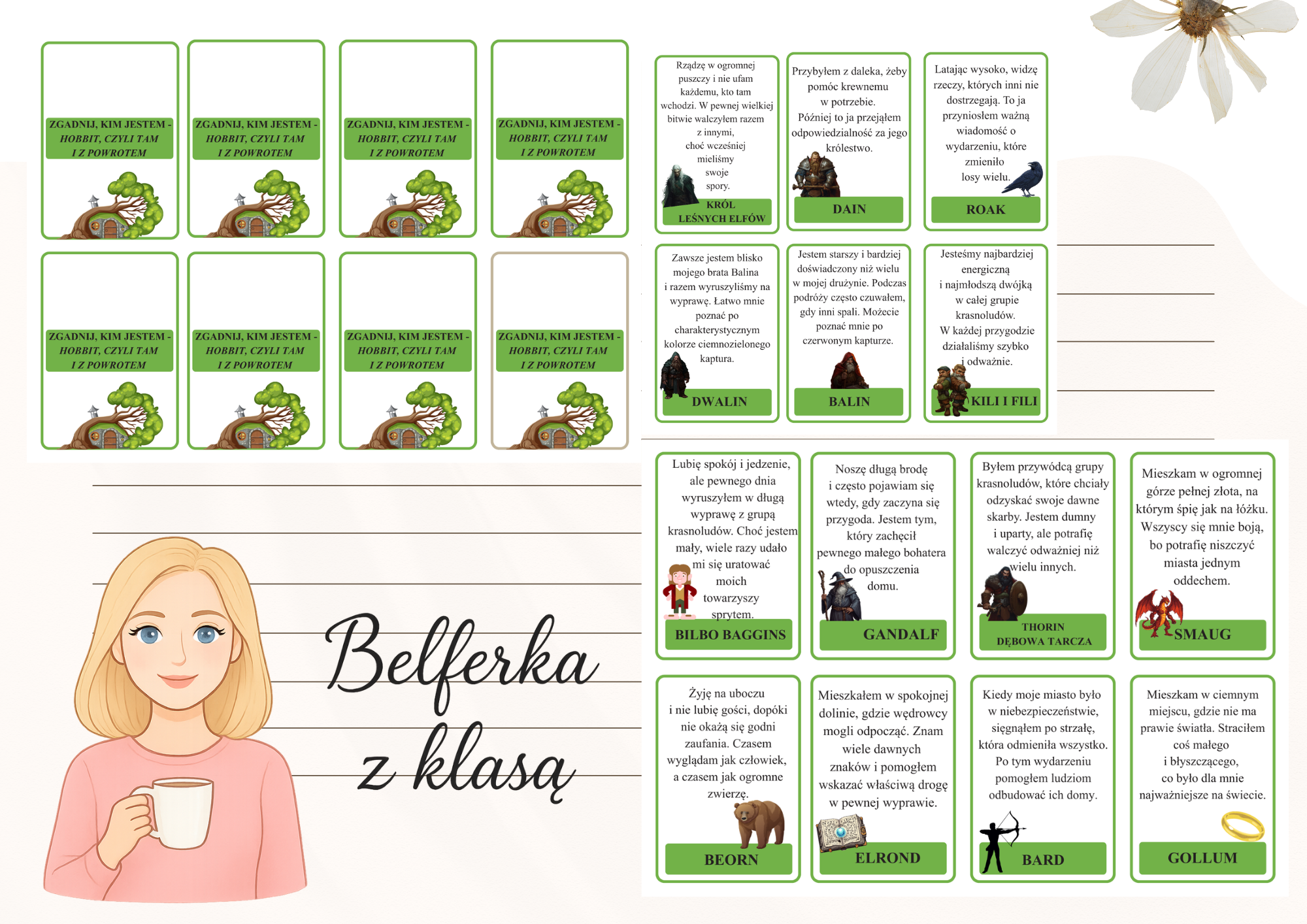 Przedstawiam zestaw dwustronnych kart zgadywanek do lektury „Hobbit, czyli tam i z powrotem”. Materiał doskonale sprawdzi się na lekcjach powtórzeniowych, utrwalających treść oraz podczas zajęć rozwijających. Uczniowie bardzo angażują się w zabawę, a dzięki formie „kim jestem?” utrwalają wiedzę o bohaterach w atrakcyjny, nieszablonowy sposób.