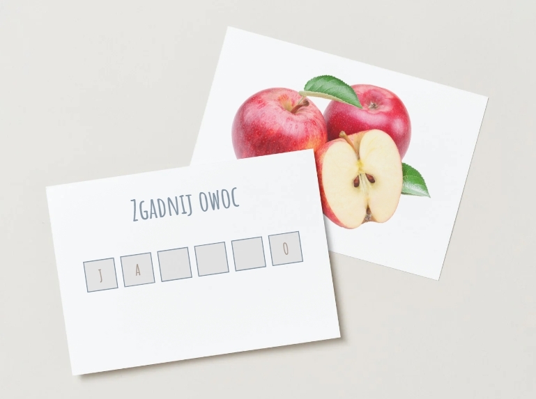 Zawiera 50 kart z owocami, które należy odgadnąć na podstawie obrazka i brakujących liter. Idealne do nauki słownictwa, ćwiczeń językowych i rozwijania spostrzegawczości! 🔤🍌