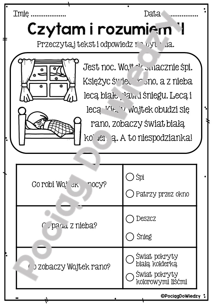 Zestaw 20 kart zawierających krótkie teksty o tematyce zimowej/świątecznej. Każda karta zawiera tekst oraz 3 pytania wyboru, sprawdzające zrozumienie tekstu. Teksty te są świetne dla przedszkolaków lub poziomu pierwszej klasy. Każdy tekst zawiera zabawny obrazek, który dziecko może pokolorować, usprawniając zarazem swoje umiejętności manualne.