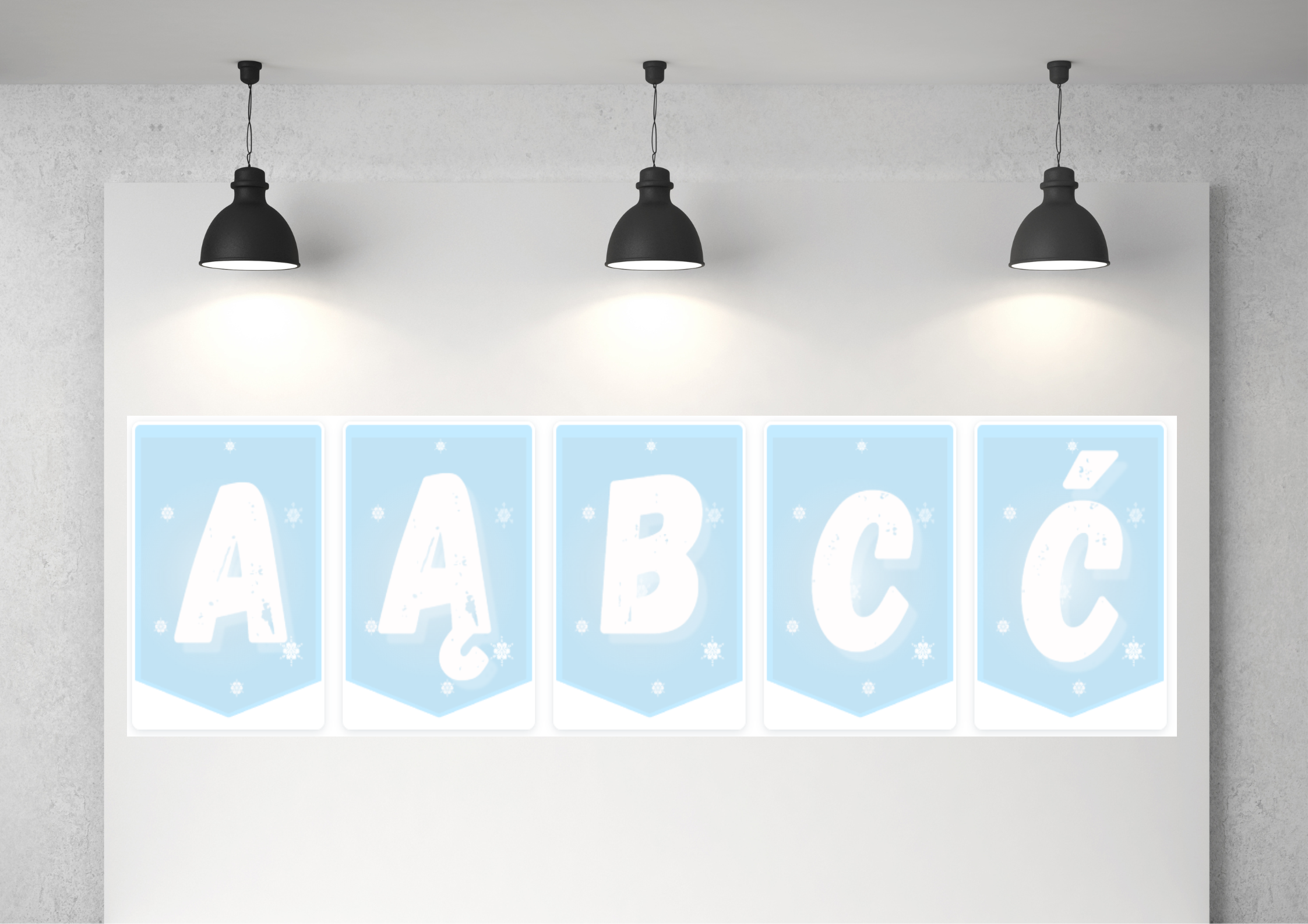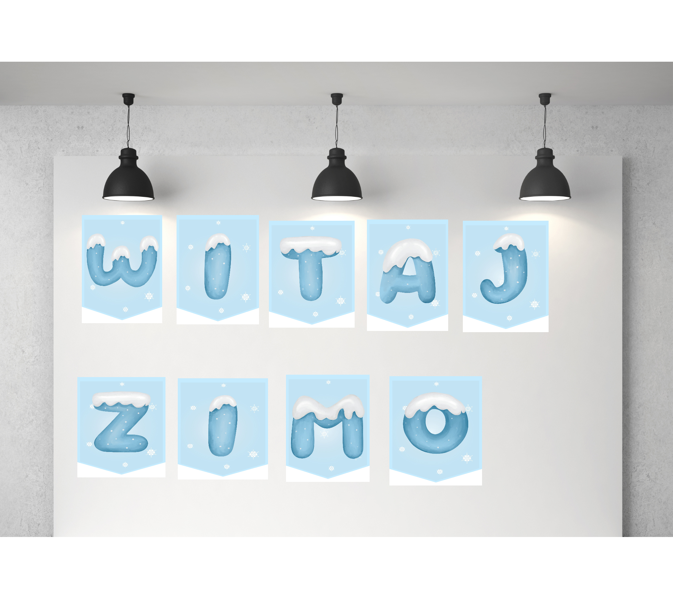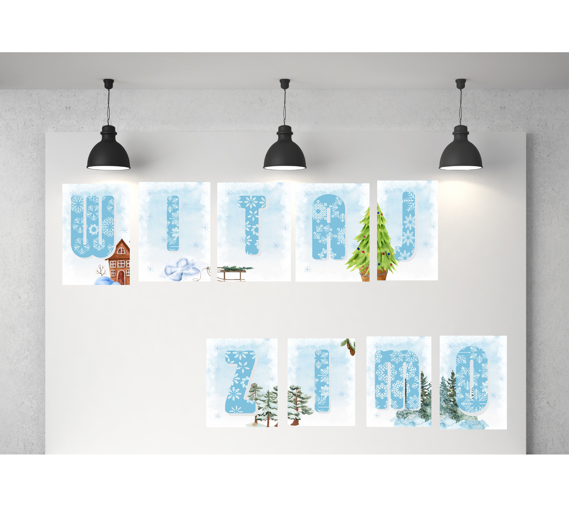 Pakiet zawiera 140 stron gotowych do druku dekoracji w różnym formacie. Napis Witaj Zimo, dekoracje XXL oraz alfabet w wersji zimowej