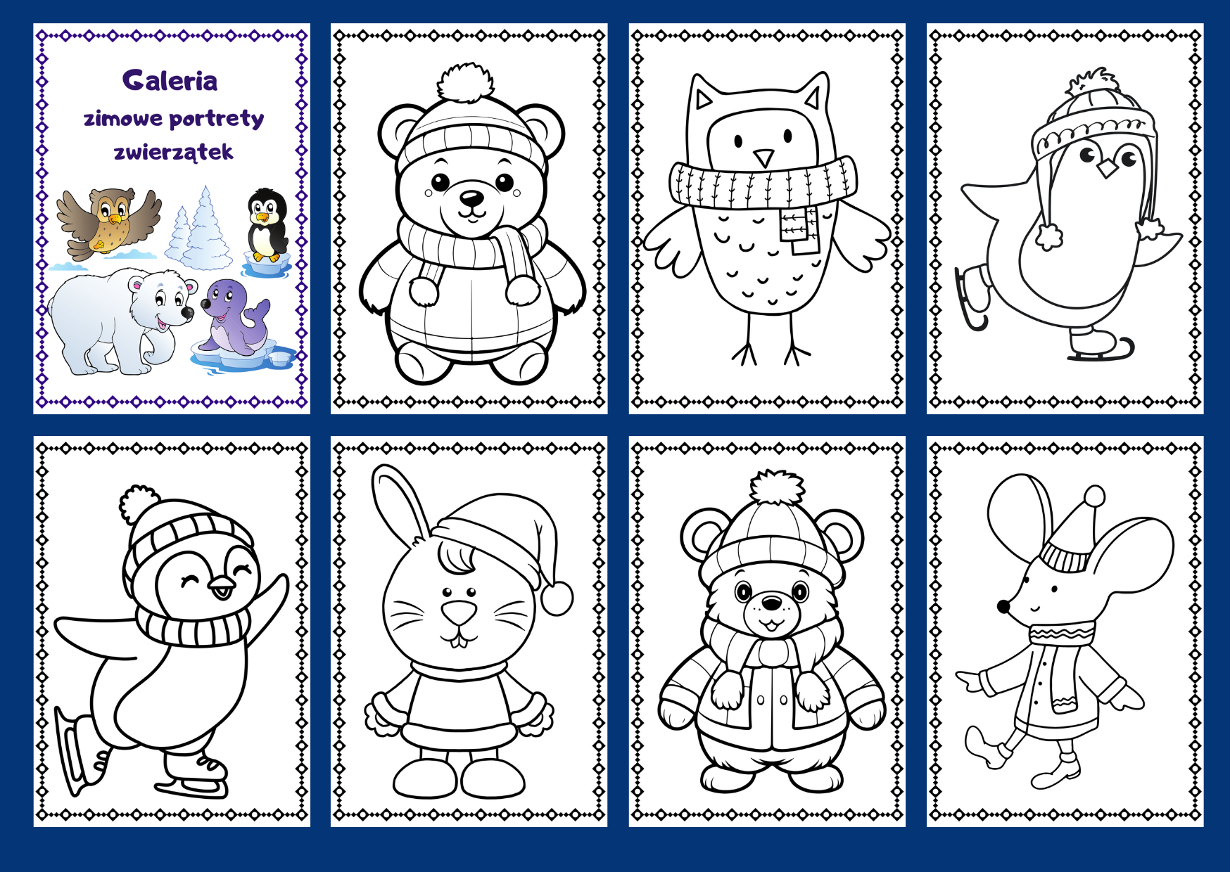 Materiał zawiera 34 kolorowanki ze zwierzątkami oraz stronę tytułową i pustą kartę z ramką. Po pomalowaniu przez dzieci kolorowanek, można stworzyć gazetkę – klasową galerię "zimowych" zwierzątek. Wszystkie karty mają format A4.