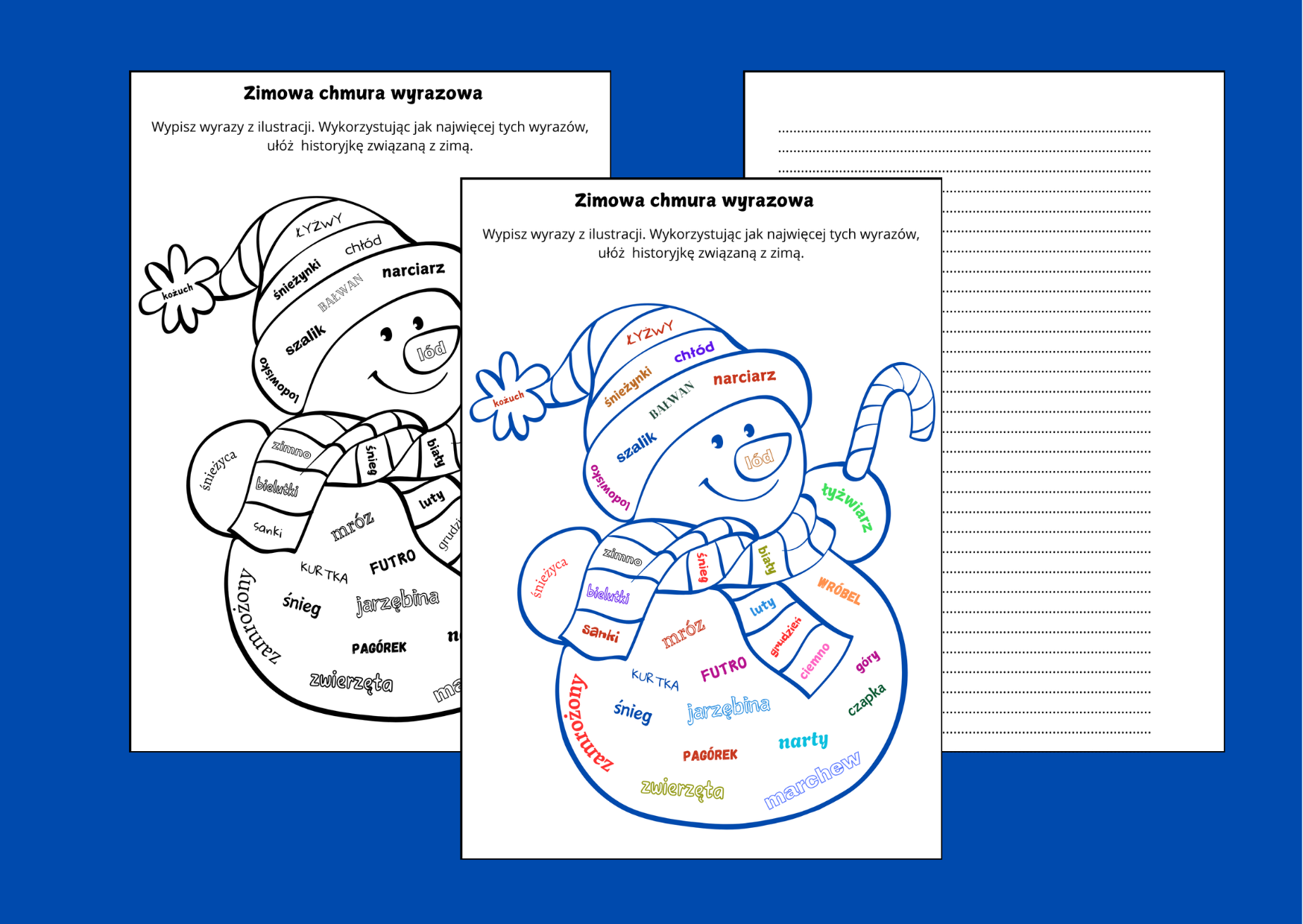 Karta pracy z "zimową" chmurą wyrazową w kształcie bałwanka, po wypisaniu wyrazów można polecić zredagowanie opowiadania/historyjki/zdań. Zamieściłam 2 wersje- kolorową i czarno-białą.