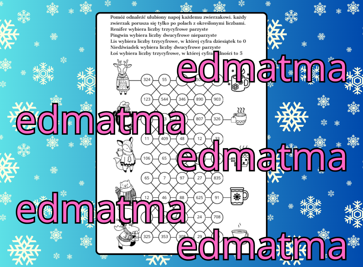 W pliku zajduję się karta pracy w formacie A4 oraz jej rozwiązanie. Zadanie polega na tym, aby każdego zwierzaka połączyć z odpowiednim kubkiem poruszając się tylko po określonych polach. Na przykład: renifer porusza się tylko po liczbach trzycyfrowych parzystych.