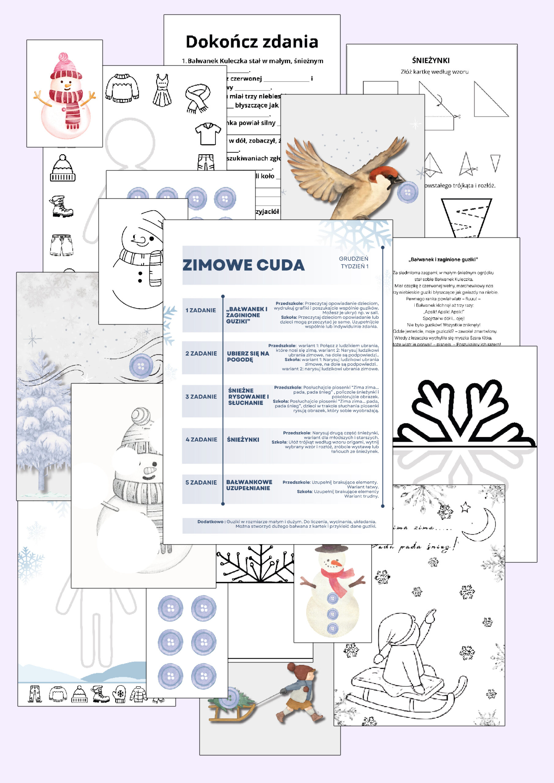 1 tydzień z pakietu zimowo-świątecznych kart pracy, zabaw i pomysłów na zajęcia dla przedszkola oraz klas 1–3 szkoły podstawowej. Każdy dzień ma przygotowaną osobną wersję dla przedszkola i dla edukacji wczesnoszkolnej.