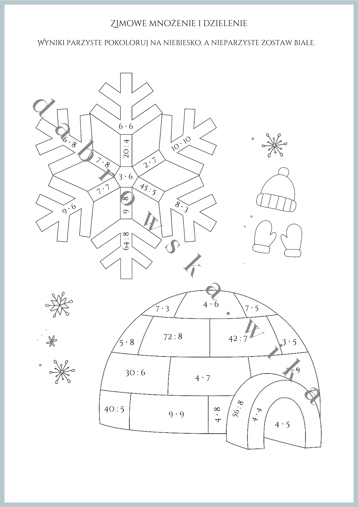 Materiał zawiera zimową kartę pracy do utrwalania tabliczki mnożenia i dzielenia.