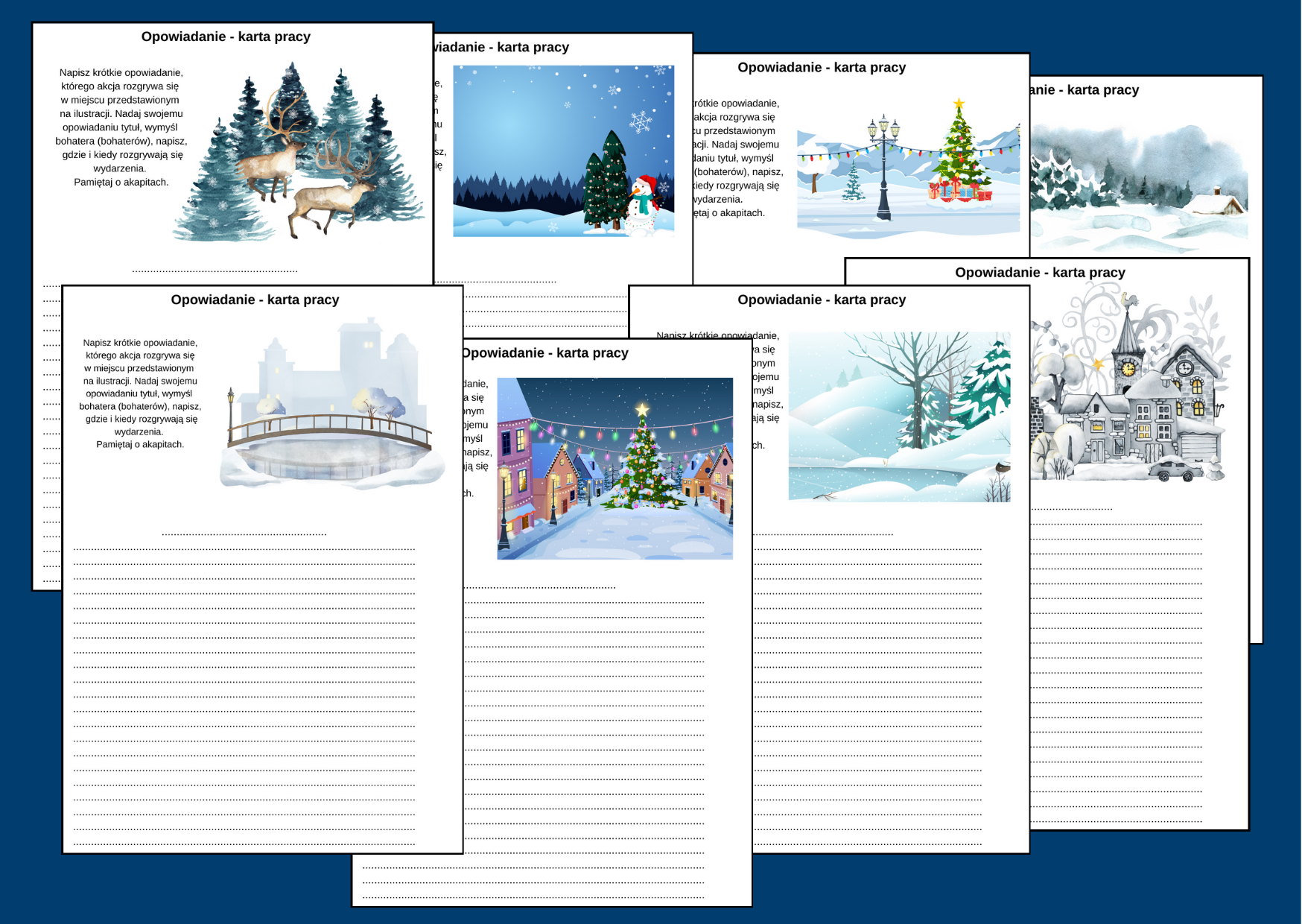 Zestaw 8 kart pracy z ilustracjami różnych miejsc. Zadanie uczniów polega na napisaniu krótkiego opowiadania, którego akcja rozgrywa się w miejscu przedstawionym na ilustracji. (dodałam pustą kartę z liniami, jeśli opowiadanie miałoby być dłuższe).