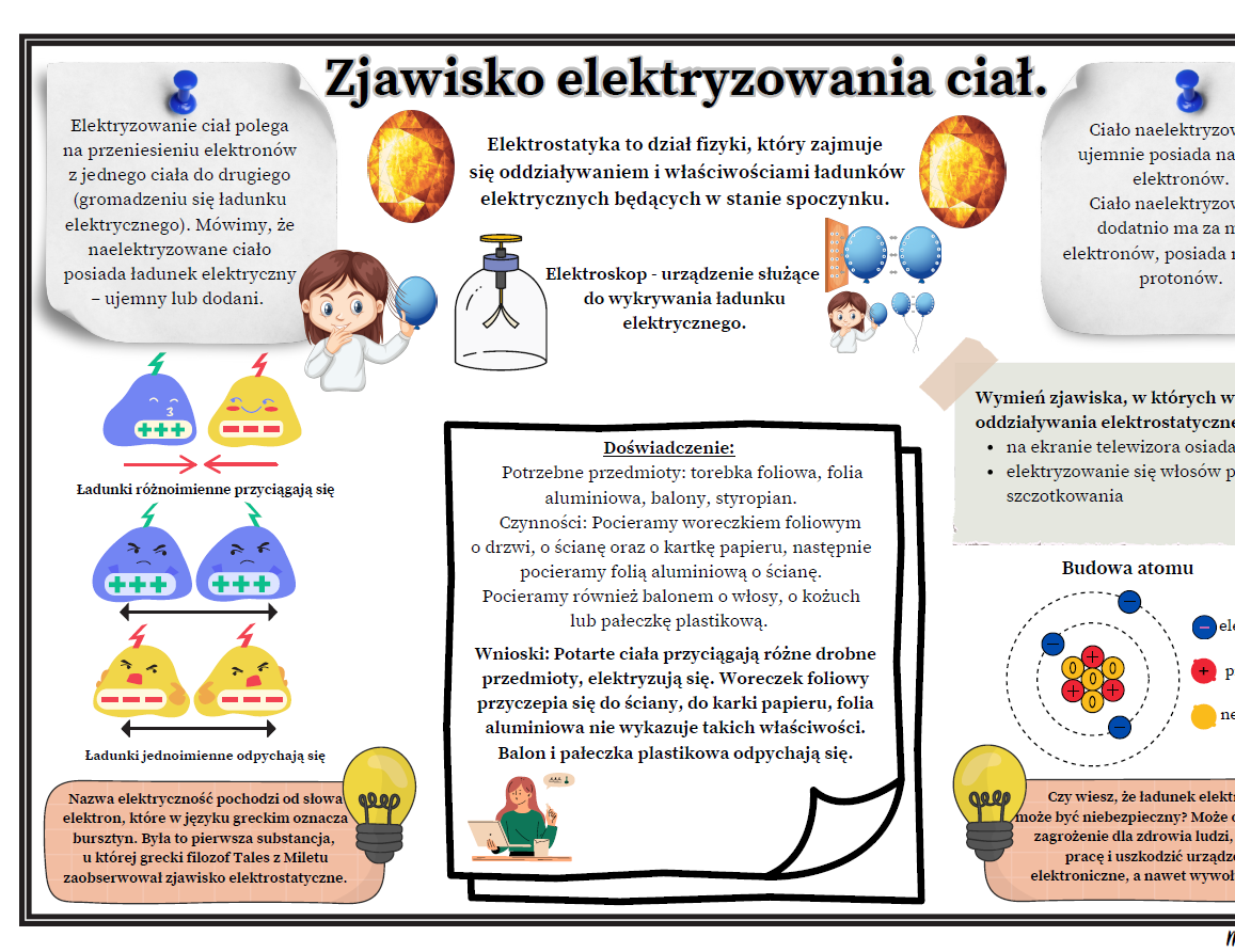 Materiał zawiera podstawowe treści na pierwszy temat o elektrostatyce statycznej, przeznaczony do szkoły podstawowej. W zestawie znajdują się dwie karty A4, jedna uzupełniona dla nauczyciela, druga dla ucznia. Aby przeprowadzić doświadczenie opisane w zestawie należy zaopatrzyć się w kawałek folii aluminiowej, woreczek foliowy, balon, kartkę papieru.