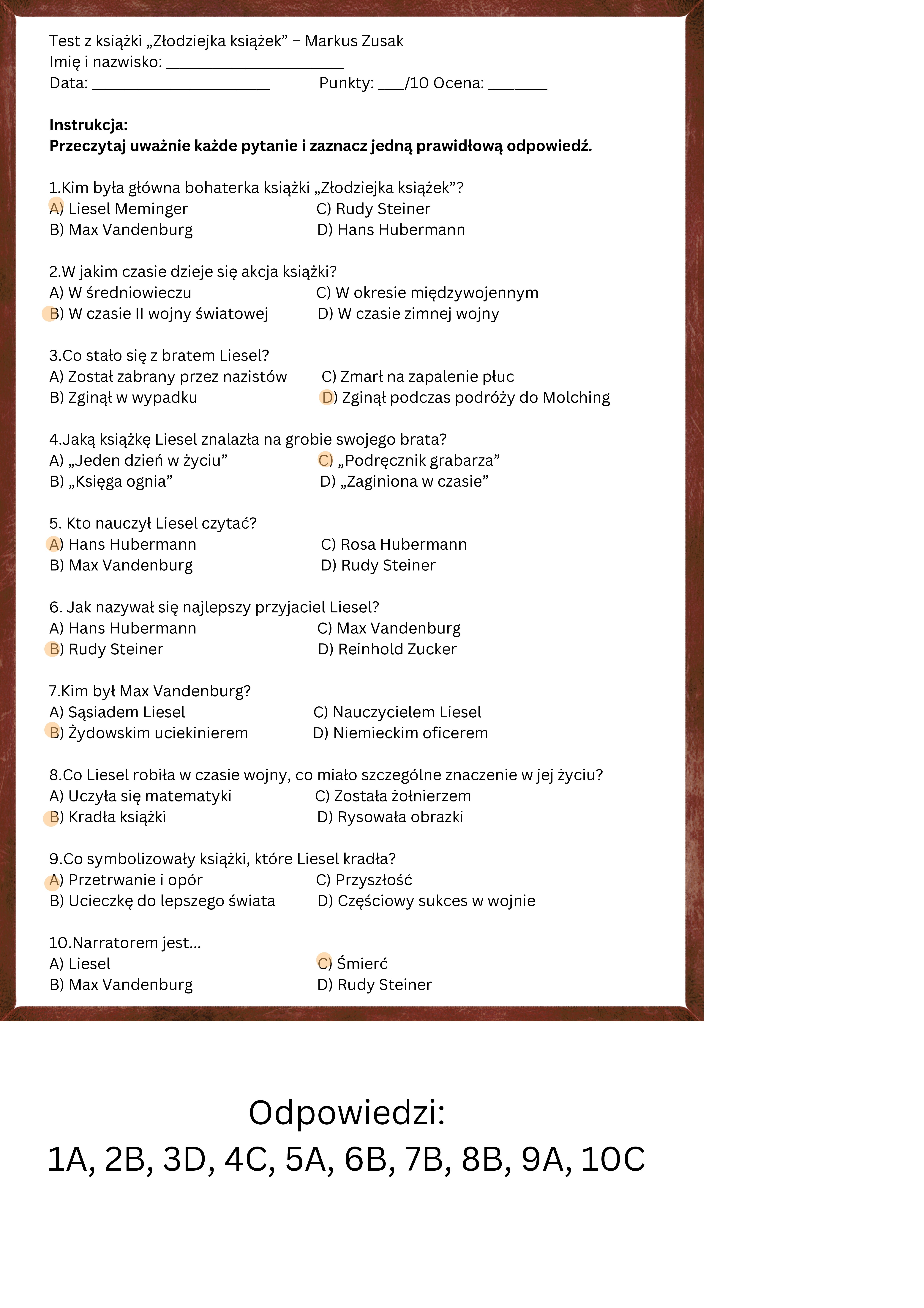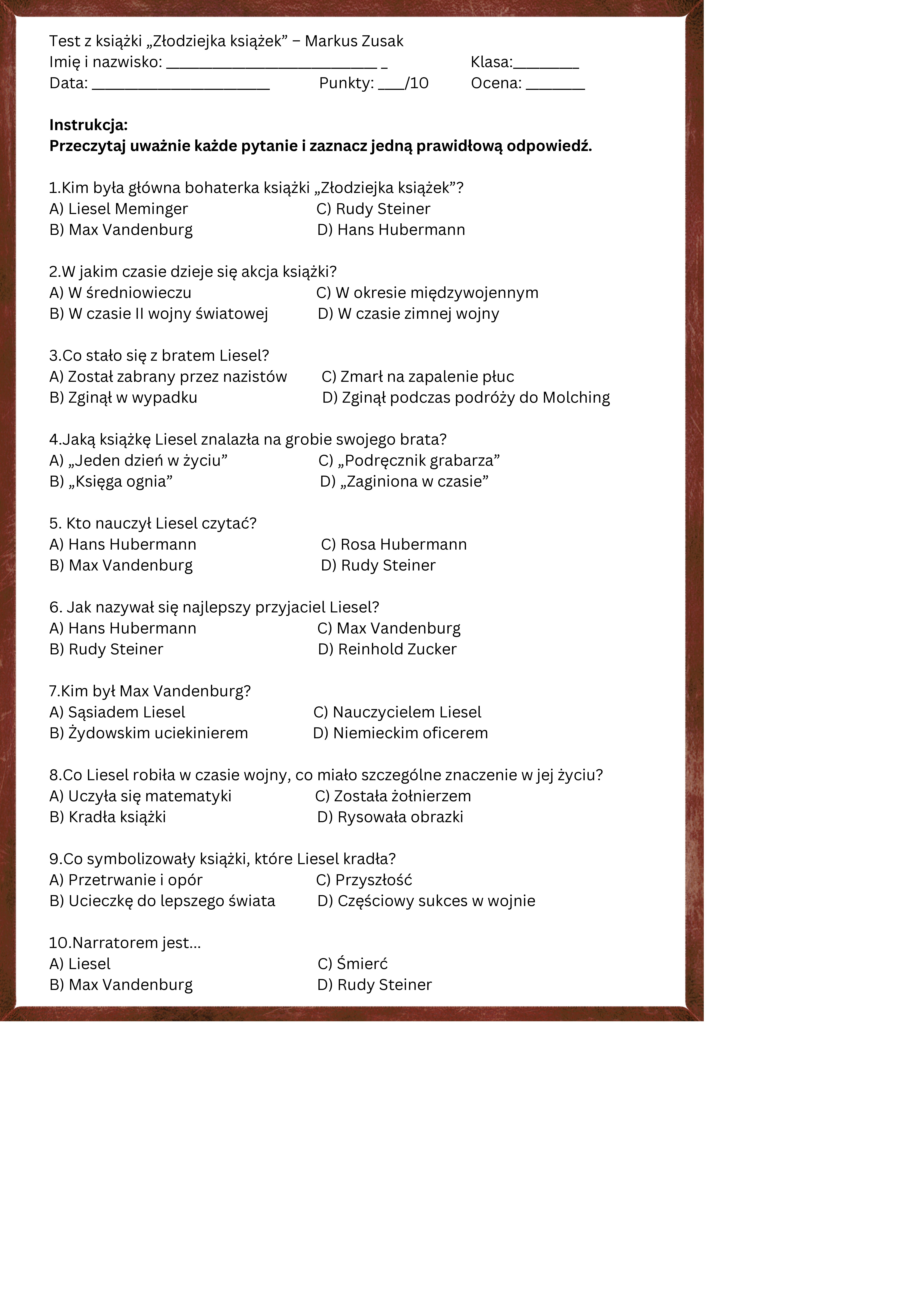 Test ze znajomości lektury "Złodziejka książek" na poziomie podstawowym. Zawiera 10 pytań zamkniętych wraz z odpowiedziami. Test można wykorzystać jako wstęp do omawiania lektury albo podsumowanie.