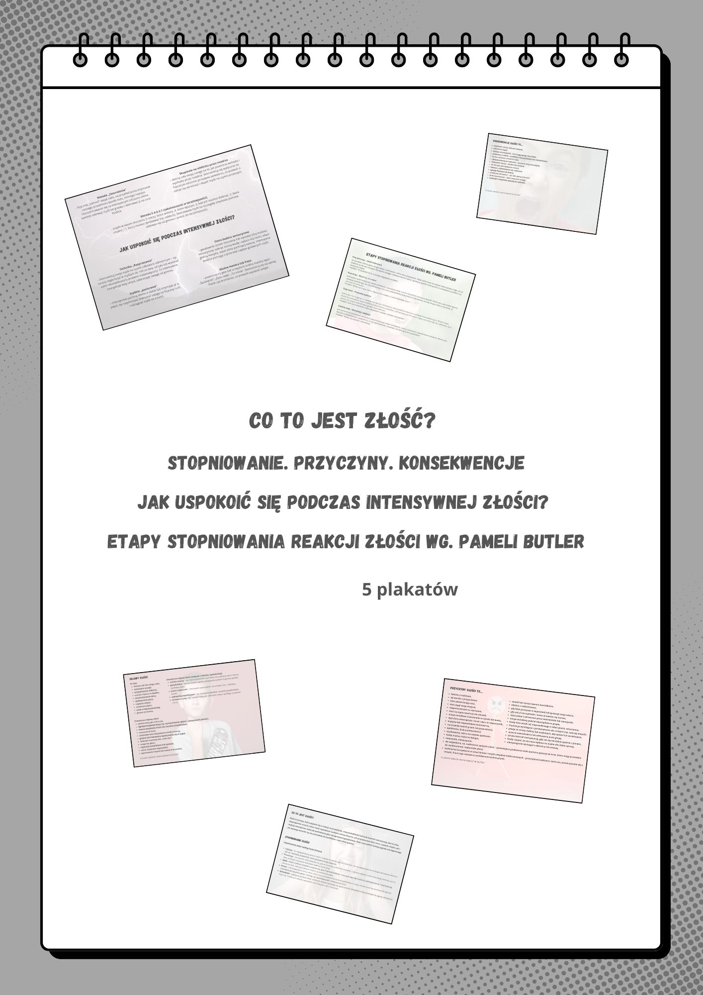 "Złość - pigułka. Jak uspokoić się podczas intensywnej złości" to zestaw pięciu tematycznych plakatów, które w przystępny sposób wyjaśniają, czym jest złość, jakie są jej stopnie oraz przyczyny i konsekwencje. Plakaty oferują skuteczne metody radzenia sobie z intensywną złością oraz metodę stopniowania reakcji złości według Pameli Butler.