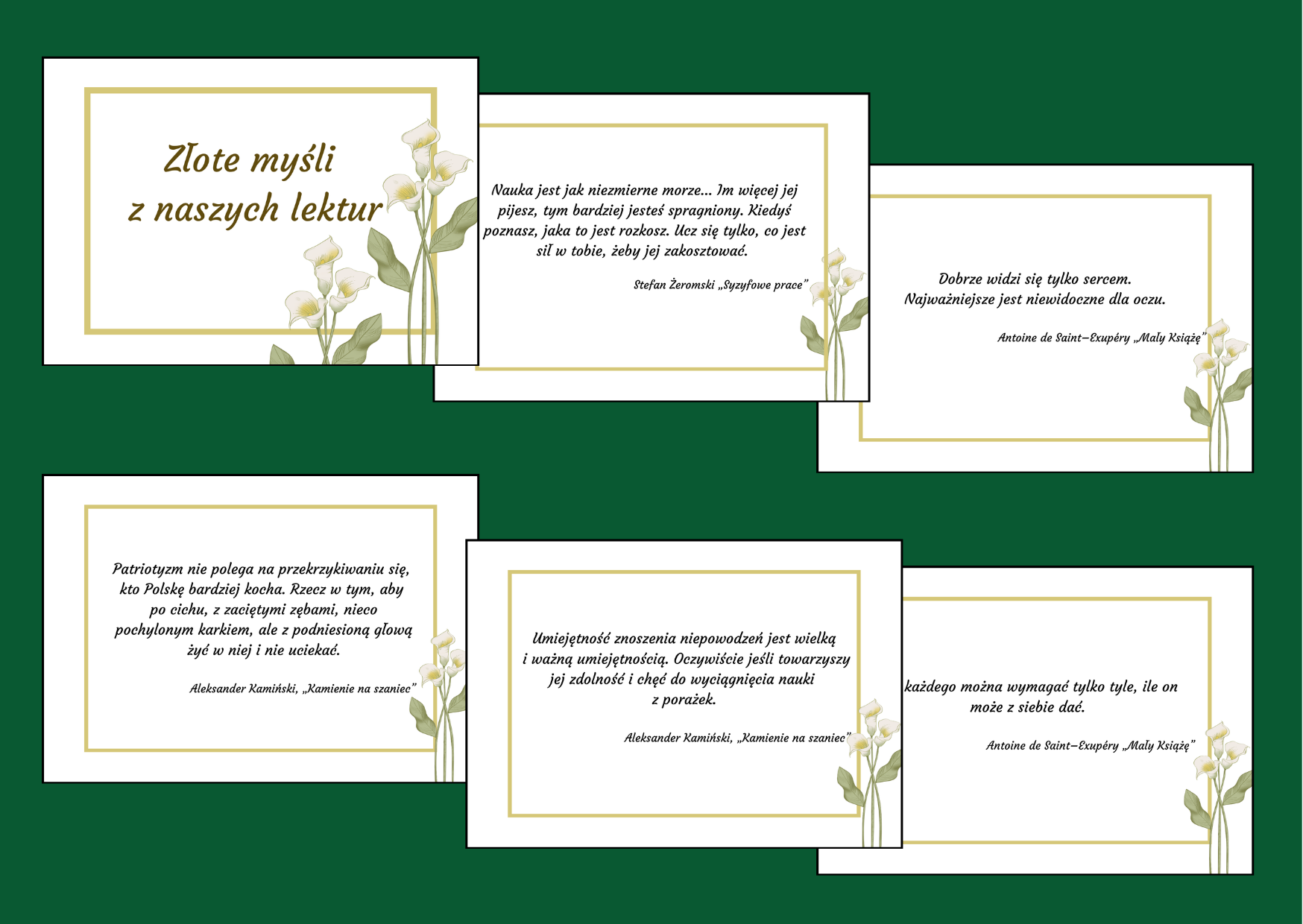 Gazetka pt. „Złote myśli z naszych lektur"” – składa się z 31 stron A4 pdf do wydruku. Na kartkach znajdują się cytaty - złote myśli z lektur z klas 7-8.