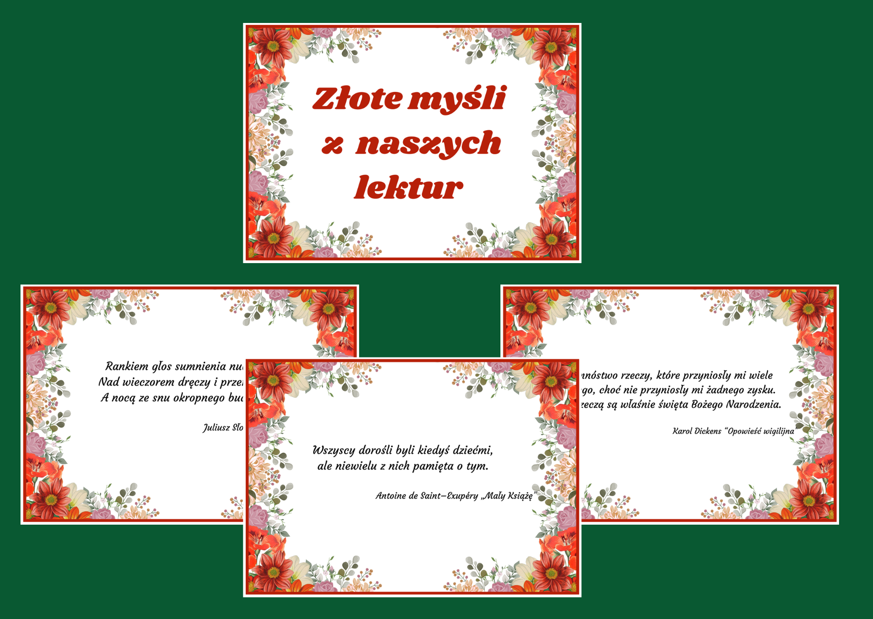 - cytaty z "Małego Księcia": https://zlotynauczyciel.pl/downloads/maly-ksiaze-cytaty-gazetka-14-stron-wersja-2/