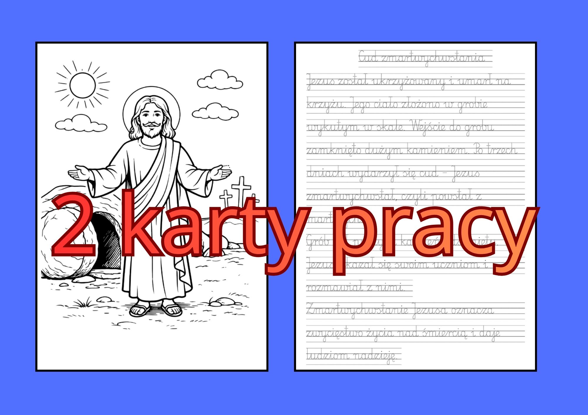 Materiał na 1 godzinę lekcyjną – notatka + kolorowanka. Doskonały na lekcję w klasach 1–3. Wspiera naukę pisania, koncentrację oraz zrozumienie tematu Wielkanocy.