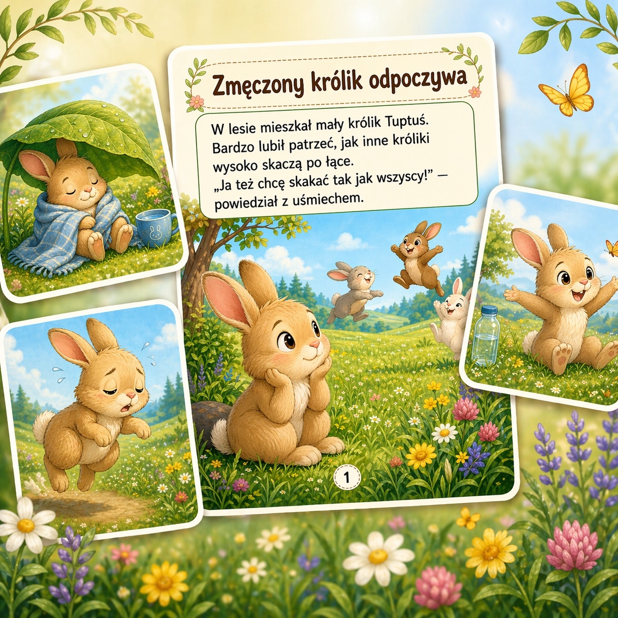 🧸 „Zmęczony królik odpoczywa” to krótka, ciepła historyjka dla dzieci o małym króliku Tuptusiu, który bardzo chciał skakać tak jak inne króliki. Po chwili zauważył jednak, że jego łapki są ciężkie, a oczka same się zamykają. Dzięki odpoczynkowi, drzemce i wodzie zrozumiał, że każdy czasem potrzebuje przerwy. 🌿💧