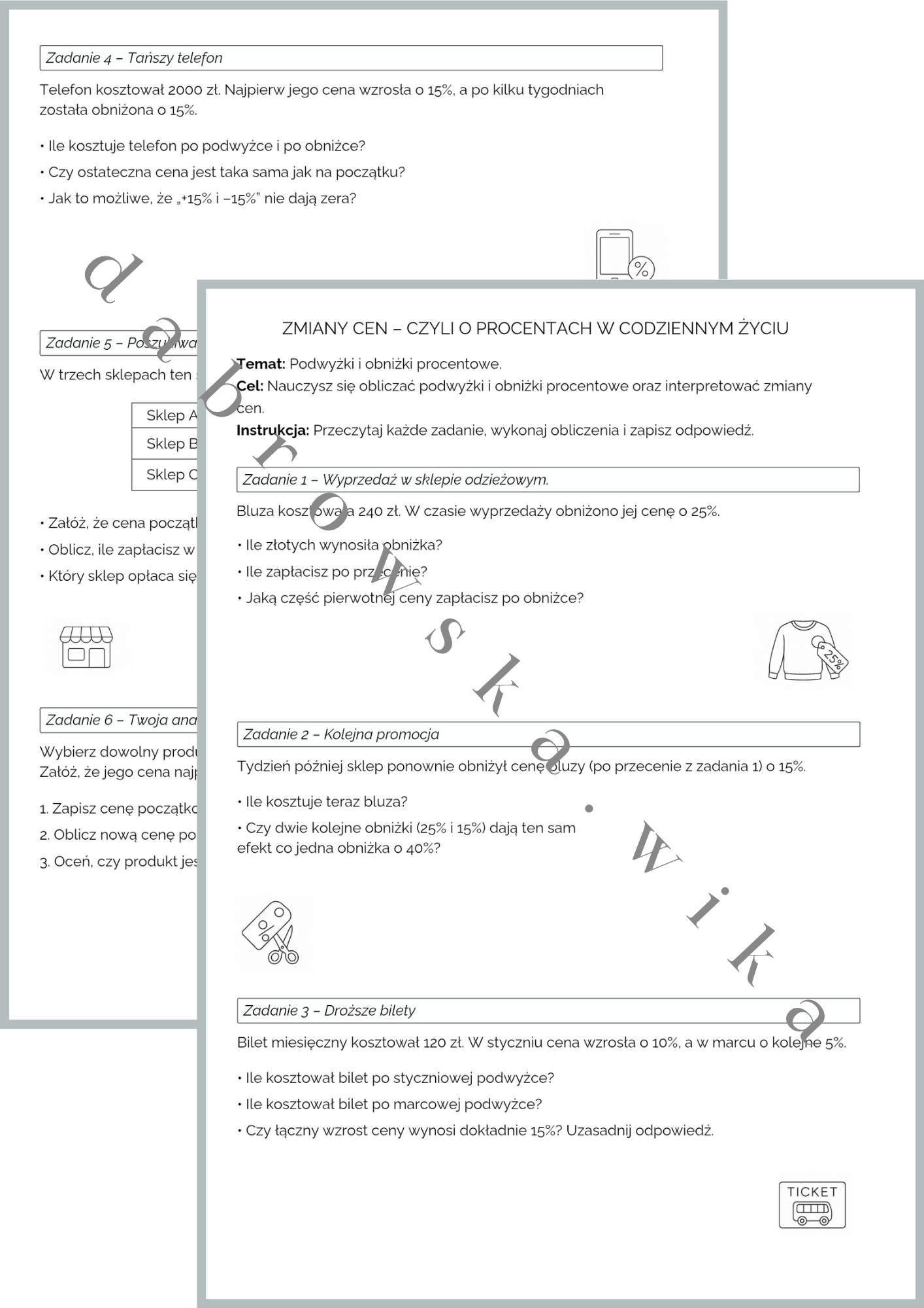 Zadania krok po kroku pokazują, jak działają procenty w praktyce – od wyprzedaży w sklepie odzieżowym, przez zmiany cen biletów i telefonów, aż po porównywanie promocji w różnych sklepach. Uczeń ma również okazję do samodzielnej analizy wybranego przykładu z życia codziennego.