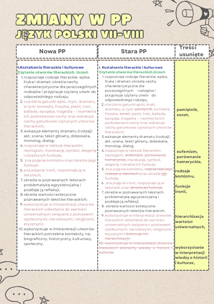 Dokument ten, przeznaczony dla nauczycieli języka polskiego uczących w szkole podstawowej w klasach VII-VIII, zawiera porównanie treści starej i nowej podstawy z 2024 roku z wyrazistym wykazem wykreślonych treści.