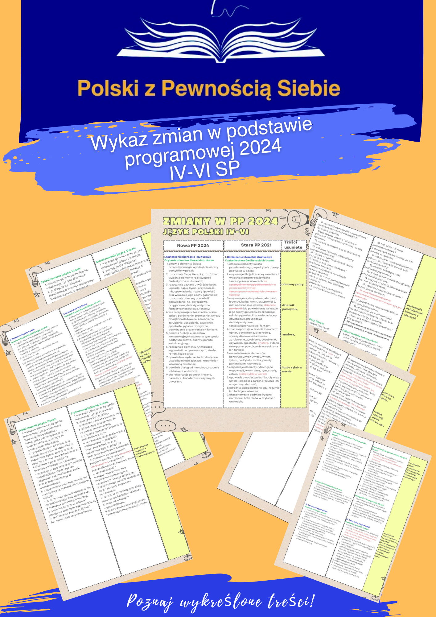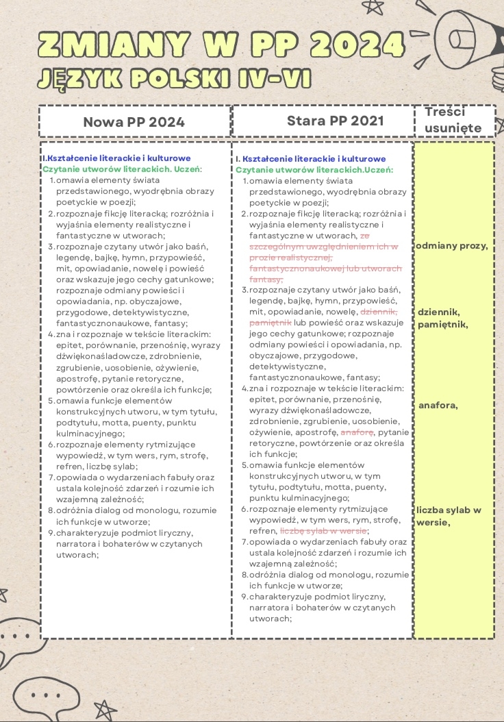 Dokument zawiera szczegółowy wykaz treści wykreślonych z podstawy programowej języka polskiego 2024 w klasach IV-VI szkoły podstawowej. Jest to pomoc dla nauczyciela tworzącego plan pracy na rok 2024/2025.