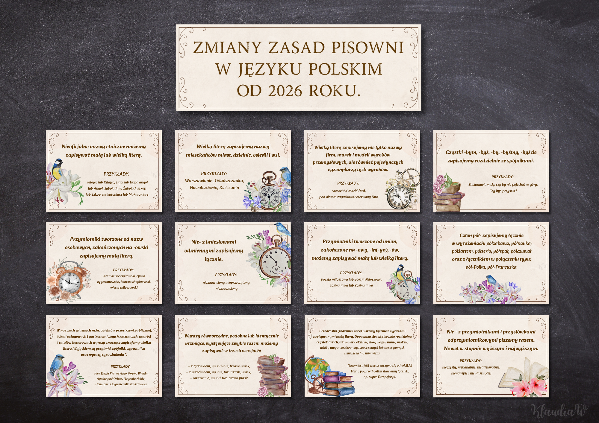 W pliku PDF: - 12 plansz edukacyjnych omawiających zmiany w pisowni języka polskiego od 2026 roku - plansza tytułowa „Zmiany zasad pisowni w języku polskim od 2026 roku” przygotowana do wydrukowania na 3 kartkach A4 (do sklejenia w jedną dużą planszę). Materiał idealnie sprawdzi się w sali języka polskiego, na korytarzu szkolnym lub w bibliotece — jako trwała i czytelna pomoc edukacyjna.