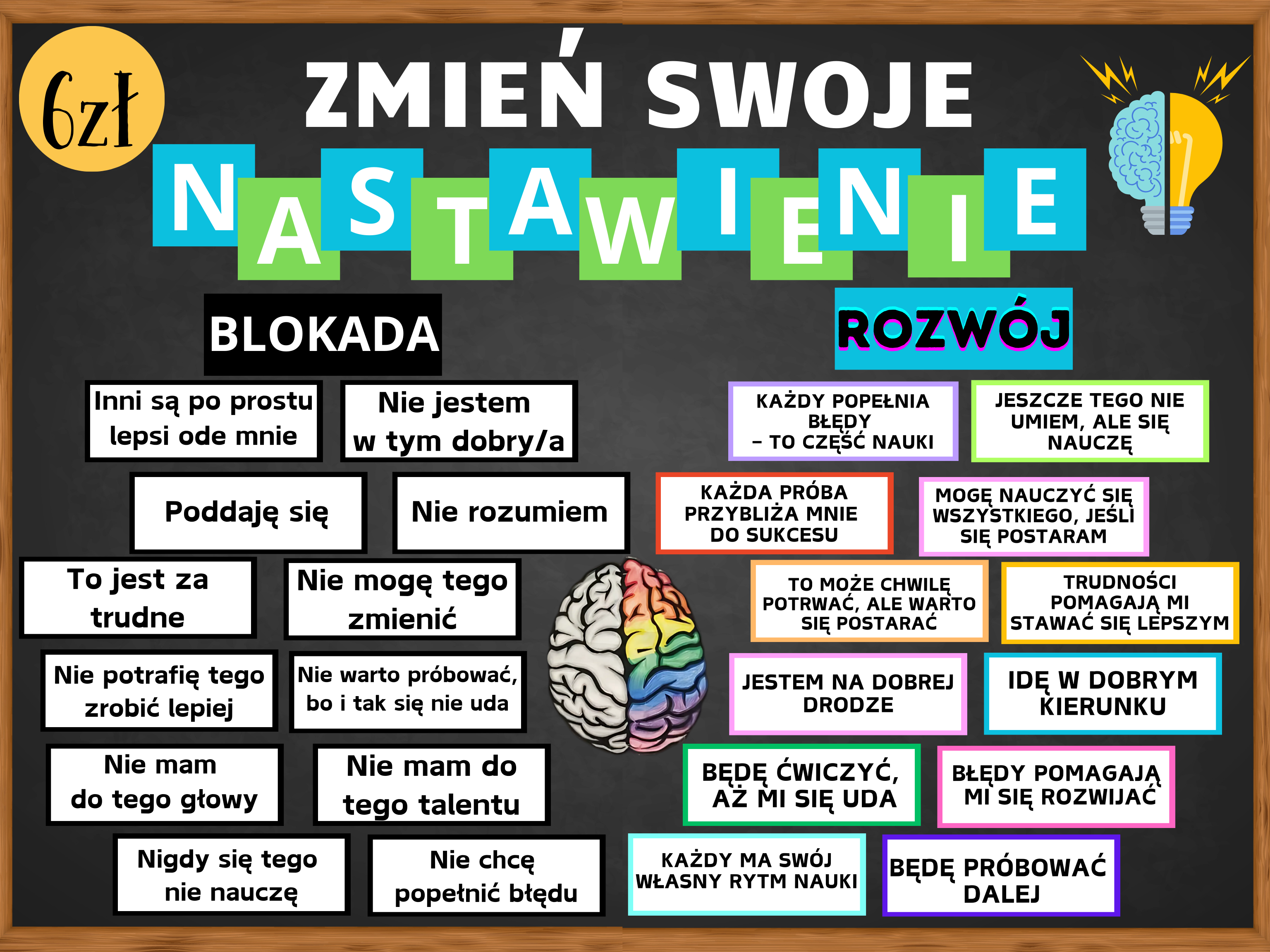 Gazetka „Zmień swoje nastawienie” to motywacja do działania i nauki. Przypomina uczniom, że sukces zaczyna się od sposobu myślenia. To świetny sposób na budowanie w szkole atmosfery wsparcia, wytrwałości i wiary w siebie! Zestaw składa się z: