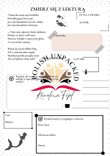 Karta pracy utworzona przeze mnie z myślą o powtórzeniach przed egzaminem ósmoklasisty, zawiera fragment utworu, uczeń musi odgadnąć, skąd on pochodzi i odpowiedzieć na kilka pytań dotyczących lektury: rodzaj literackich, gatunek i cechy, podać czas i miejsce akcji, wyjaśnić sens metafory, wyjaśnić motywy występujące w utworze.
