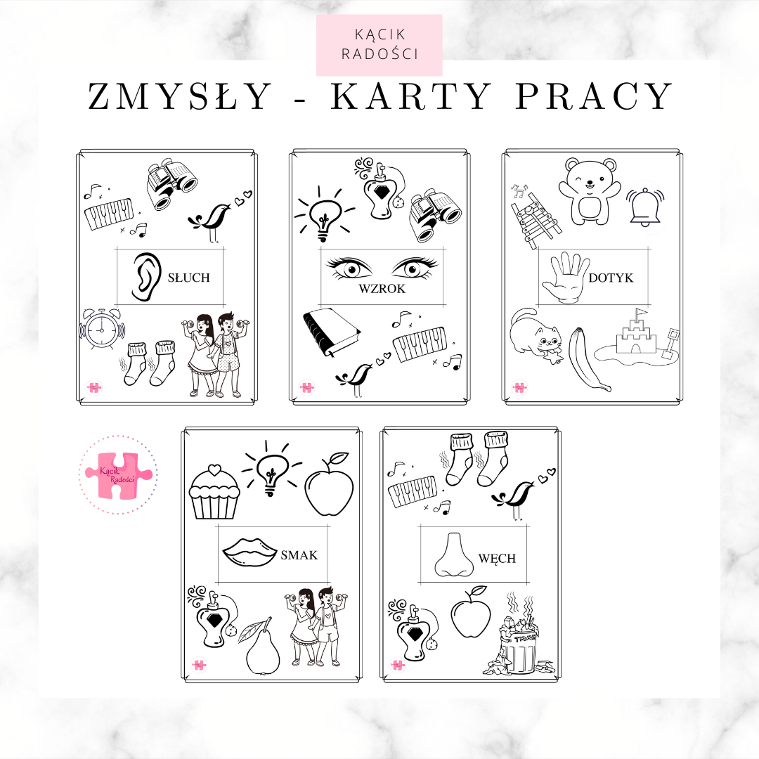 Zestaw "zmysły - kolorowanki" składa się z 5 kart A4. Zadaniem dziecka jest pomalować rysunki, które reprezentują dany zmysł.