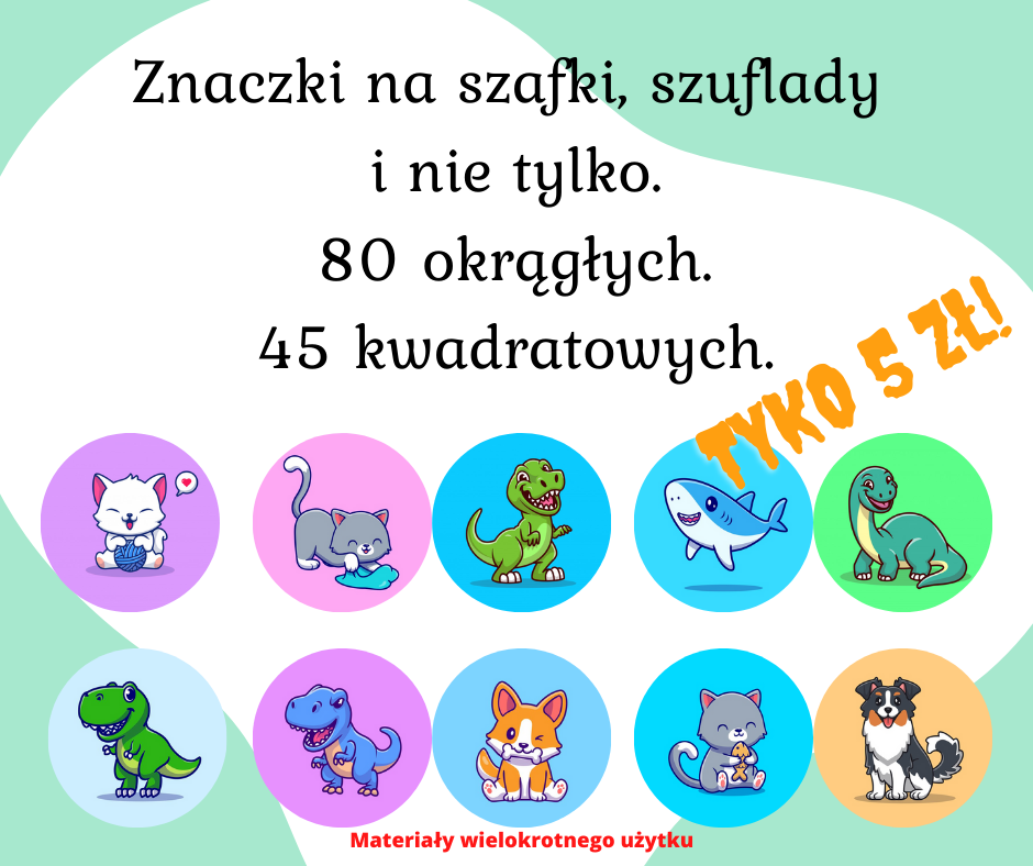 Pakiet zawiera 45 znaczków kwadratowych oraz 80 okrągłych. Do wyboru do koloru. Materiały wielokrotnego użytku