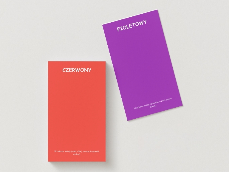 - Zestaw atrakcyjnych kart w żywych barwach (z oznaczeniami HEX), które pomogą dzieciom szybko i skutecznie rozpoznawać oraz nazywać kolory.
