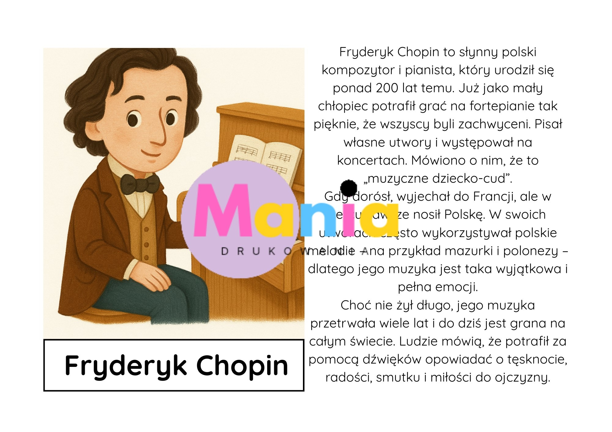 Poznajcie nasz najnowszy zestaw edukacyjny: 33 znane postacie z Polski – każda przedstawiona na osobnym arkuszu A4 w poziomie. W zestawie znajdziesz m.in. naukowców, artystów, sportowców i bohaterów historycznych – wszystkie postacie opatrzone krótkim, przystępnym opisem dla dzieci.