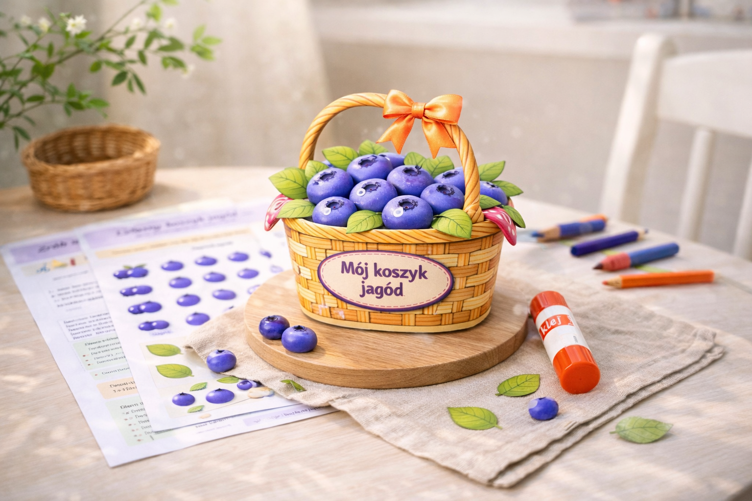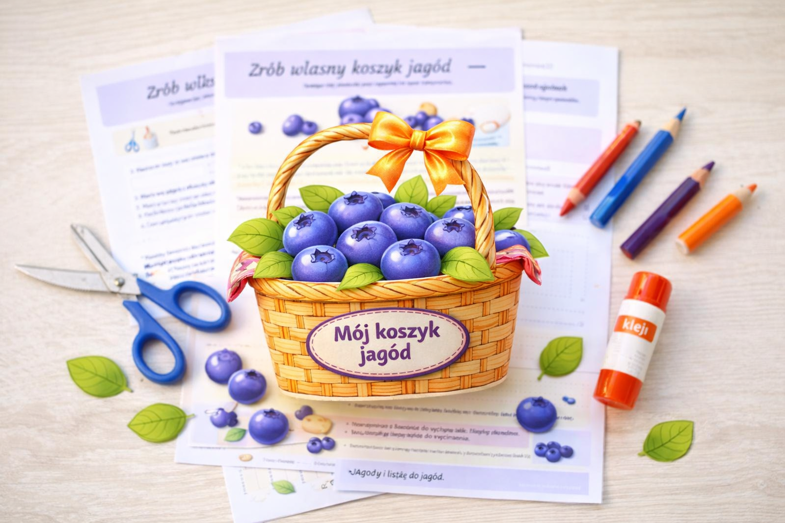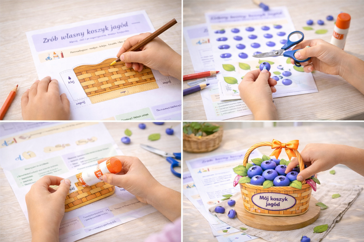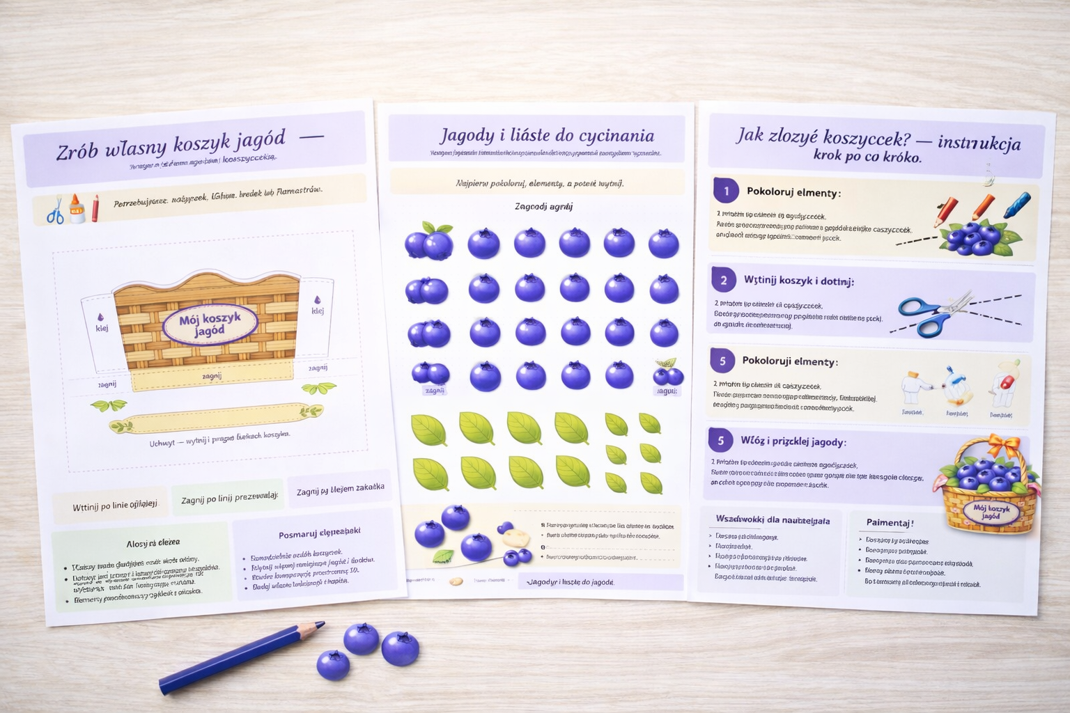 W środku znajduje się szablon koszyczka, dodatkowe jagody i liście do wycinania oraz czytelna instrukcja krok po kroku, dzięki której przygotowanie pracy jest proste i przyjemne. Zestaw zawiera także wersję łatwiejszą i trudniejszą, więc możesz dopasować poziom do wieku i umiejętności dziecka.