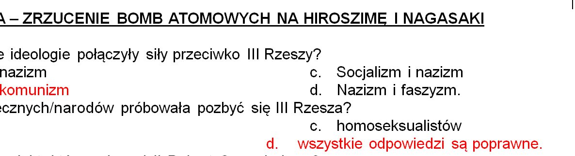 W dokumencie umieszczono zadania dotyczące poziomu zrozumienia fragmentu filmu pt. Historia świata dotyczącego zrzucenia bomb atomowych na Hiroszimę i Nagasaki. W zadaniach zamieszczono poprawne odpowiedzi zapisane czerwoną czcionką.