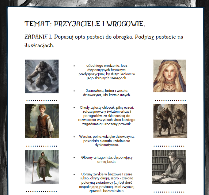 - dopasowaniu opisu bohatera z książki do ilustracji oraz podpisanie o kogo chodzi