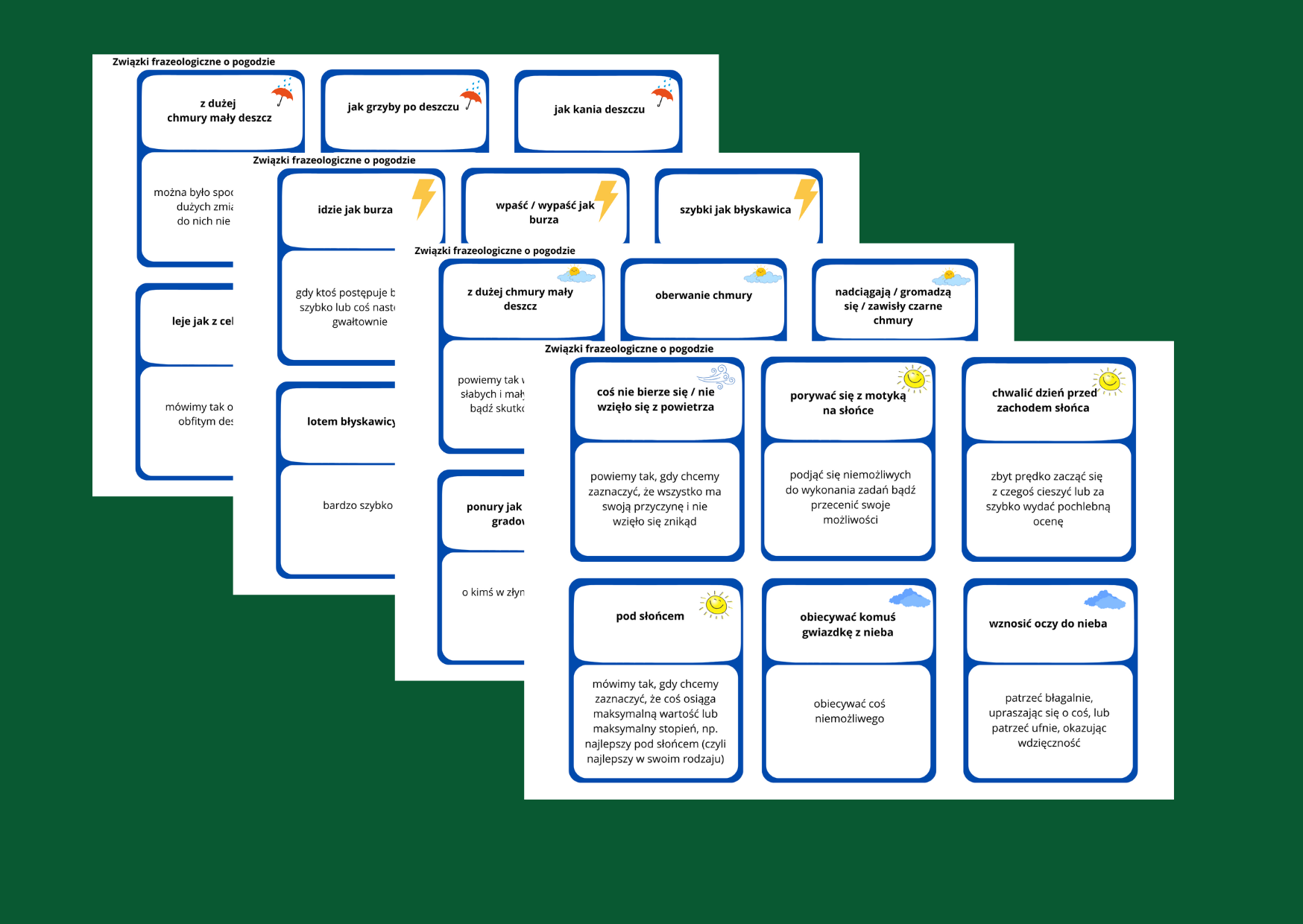 Materiał zawiera 9 stron z fiszkami ( 54 fiszki), które dotyczą frazeologizmów związanych z pogodą i różnymi zjawiskami.