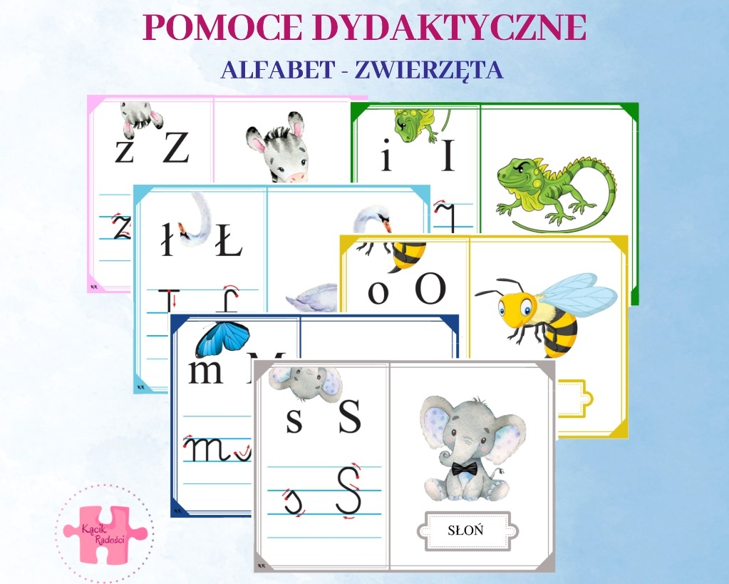Na każdej karcie znajduje się litera oraz zwierzę, którego nazwa zaczyna się na daną głoskę.