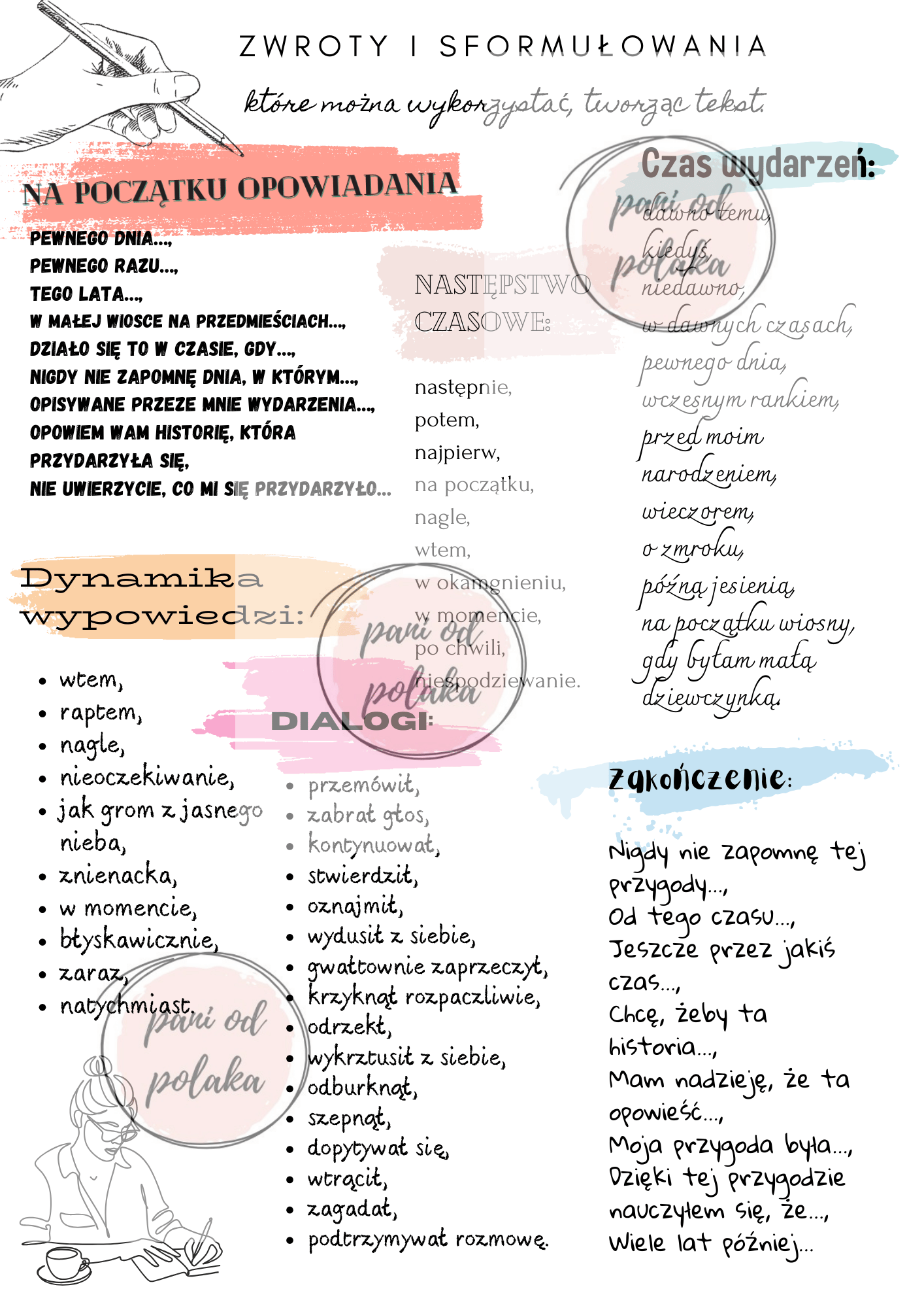 Jednostronicowa wklejka przyda się zarówno uniom, którzy dopiero uczą się jak pisać opowiadania, jak i ósmoklasistom, którzy chcieliby usprawnić swoją pracę, powtórzyć materiał, wzbogacić słownictwo. Uczniowie często pytali mnie: Proszę pani, od czego mogę zacząć? To pytanie sprawiło, że powstała ta obszerna w zwroty wklejka, która przyspieszyła tempo pisania tekstu przez uczniów, poprawiła język prac i poprawiła ich swobodę wypowiedzi, a pytanie: Proszę pani, od czego mogę zacząć? zniknęło:)