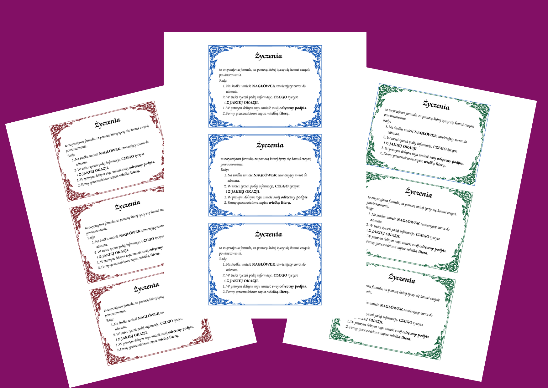Zestaw zawiera wklejkę do zeszytu dotyczącą zasad pisania życzeń (3 wersje kolorystyczne).